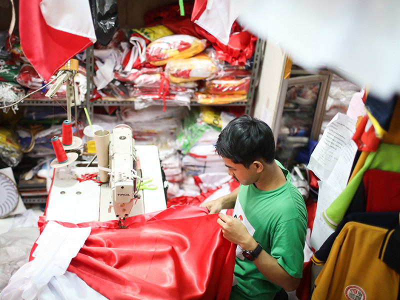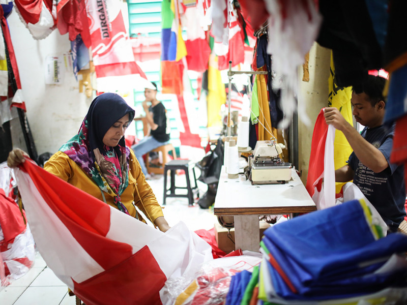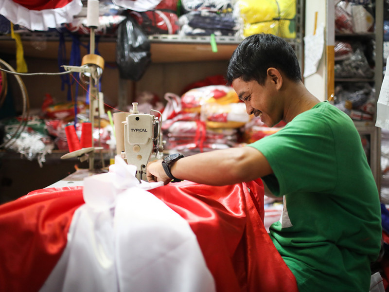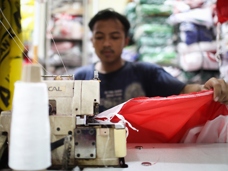 Pekerja menjahit bendera dan umbul-umbul di tempat konveksi sekaligus toko di Pasar Senen, Kecamatan Senen, Jakarta Pusat. Menjelang Hari Ulang Tahun (HUT) ke-77 Kemerdekaan Republik Indonesia, penjualan bendera dan umbul-umbul merah putih mengalami peningkatan yang cukup signifikan. (Foto: Nugroho Sejati/beritajakarta.id)
