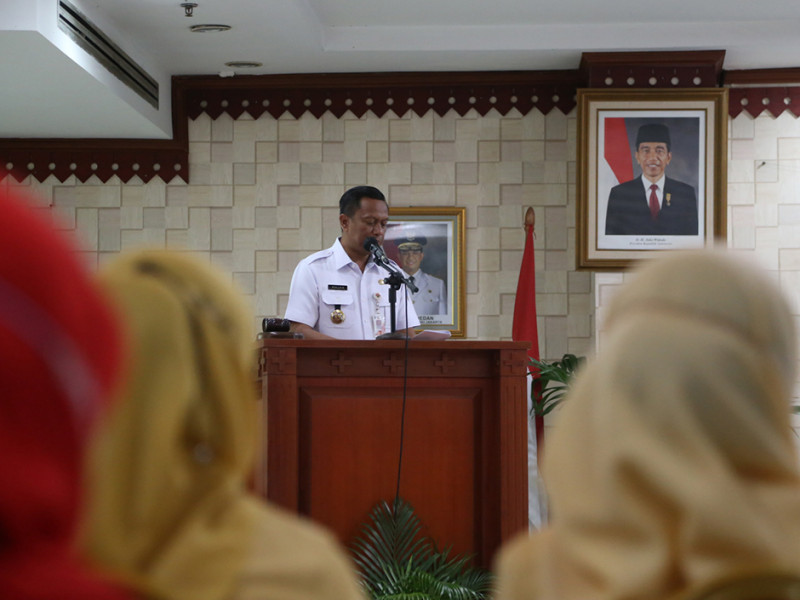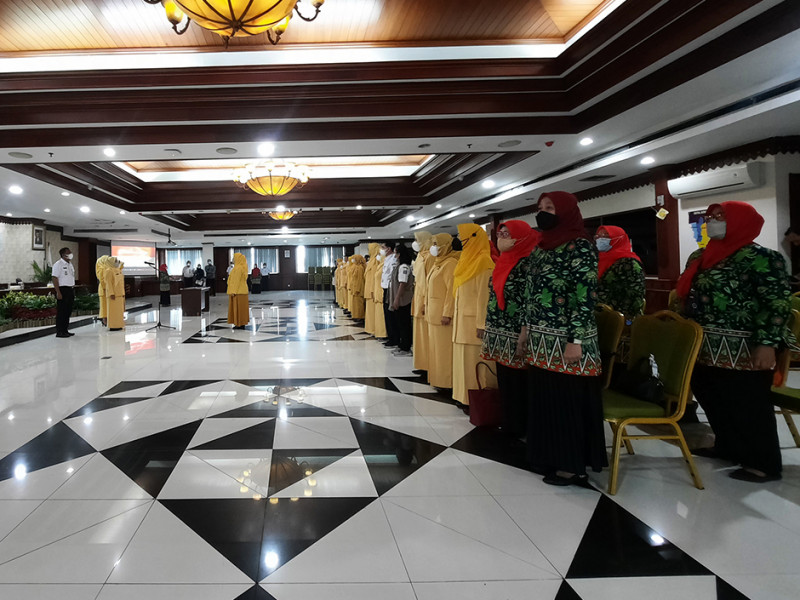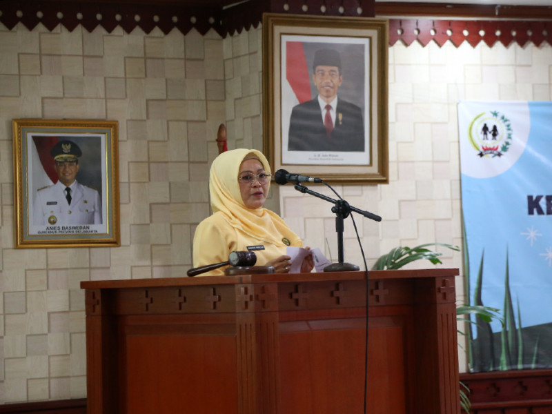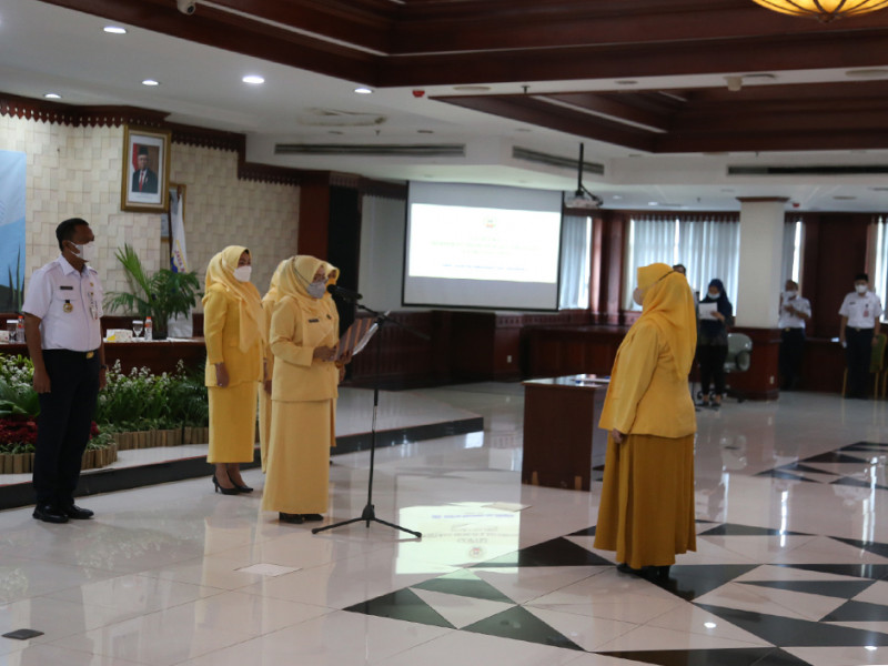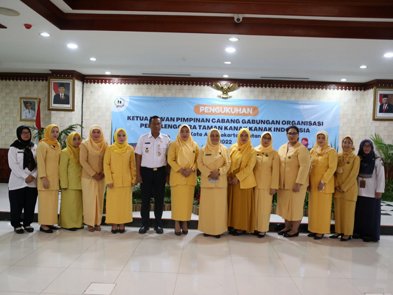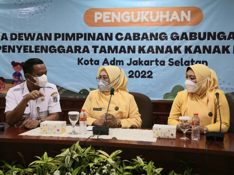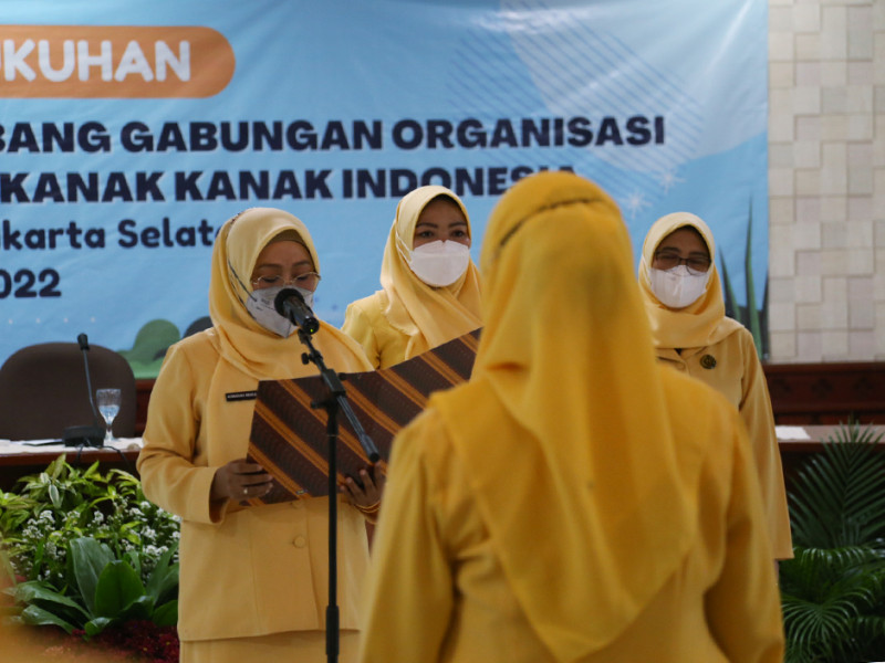 Ketua Dewan Pimpinan Daerah Gabungan Organisasi Penyelenggara Taman Kanak-kanak Indonesia (DPD GOPTKI) Provinsi DKI Jakarta, Komariah Marullah mengukuhkan Eka Ali Murthadho sebagai Ketua Dewan Pimpinan Cabang (DPC) GOPTKI Kota Administrasi Jakarta Selatan periode 2022-2025 di Ruang Pola Kantor Wali Kota setempat, Rabu (10/8). Dalam arahannya, Komariah berharap ketua baru ini bisa menjalankan program kerja dengan baik serta mampu berkolaborasi bersama pihak-pihak terkait. (Foto: Reza Hapiz/beritajakarta.id)