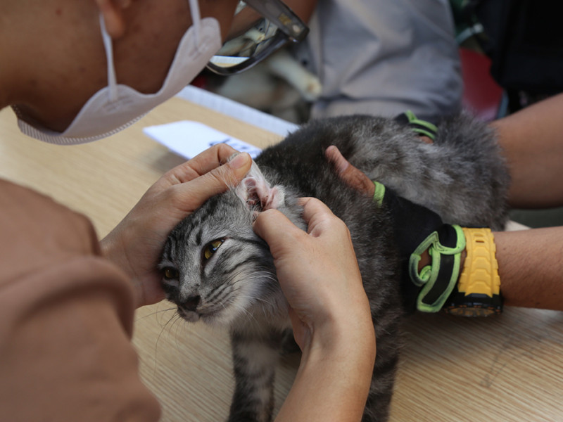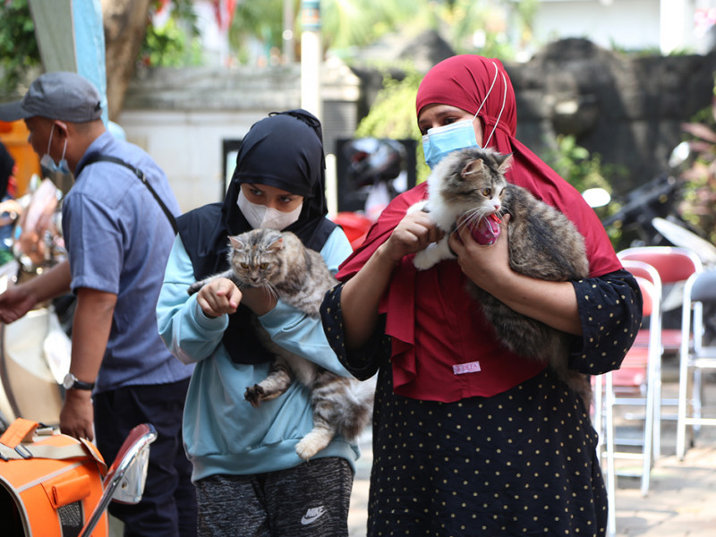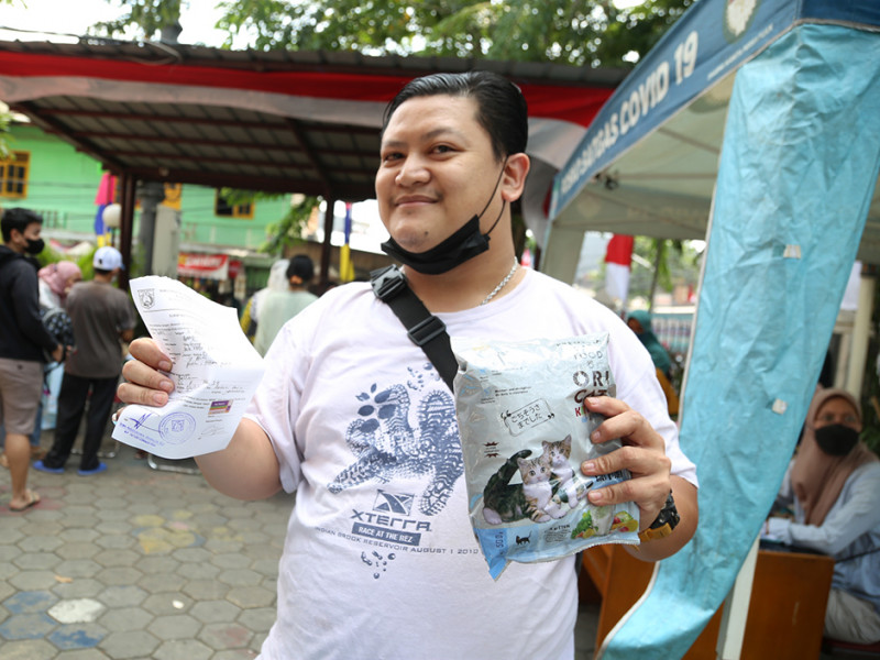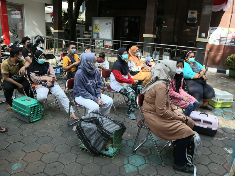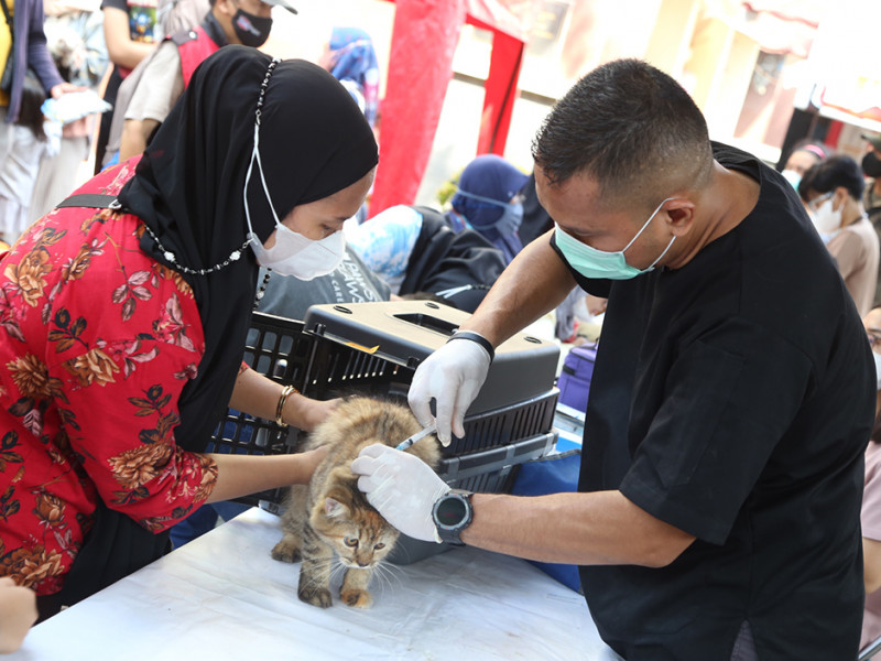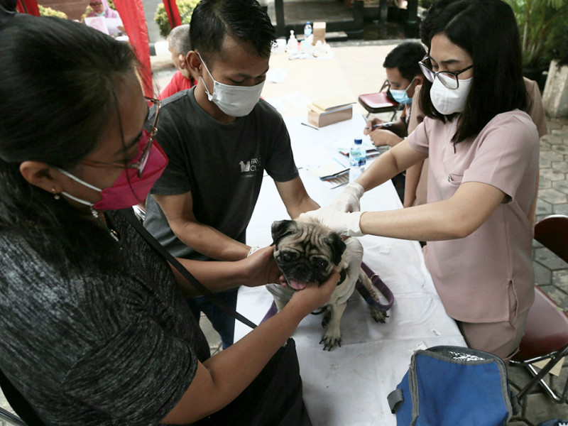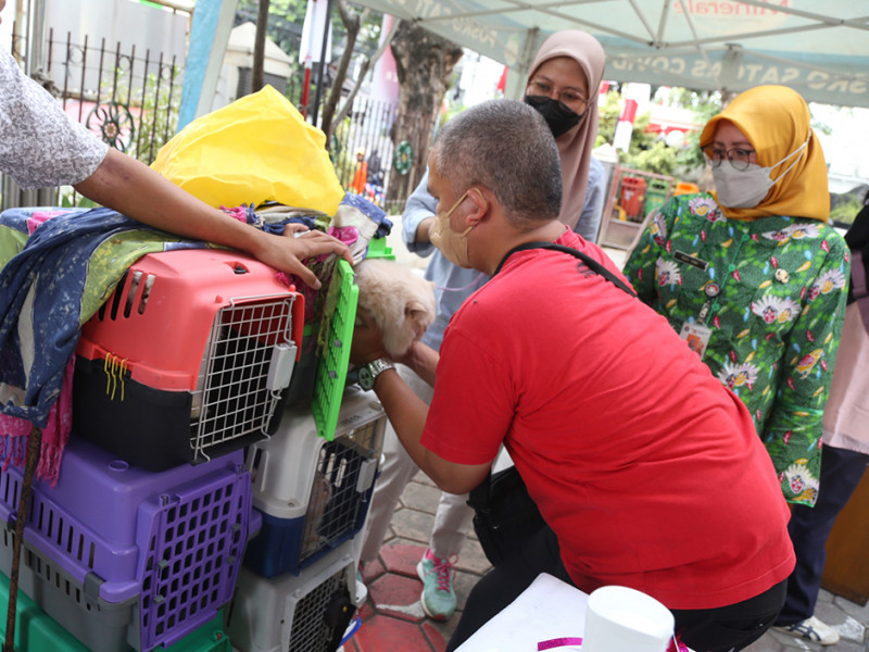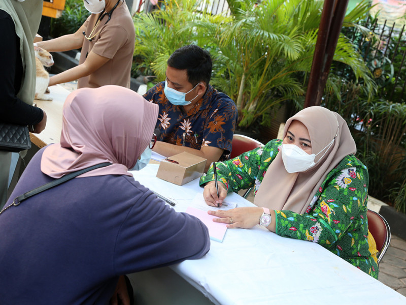 Suku Dinas Ketahanan Pangan, Kelautan, dan Pertanian (Sudin KPKP) Jakarta Selatan melayani pemberian vaksin bagi hewan penular rabies (HPR) di halaman Kantor Kelurahan Kebon Baru, Jalan Asem Baris Raya, Kecamatan Tebet, Kamis (11/8). Layanan ini disambut antusias warga pemilik hewan. Selain vaksinasi, pihaknya juga berkolaborasi dengan Petshop Paws And Claws membagikan makanan hewan secara gratis. (Foto: Reza Hapiz/beritajakarta.id)