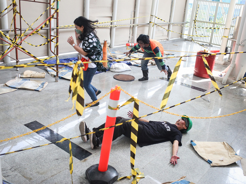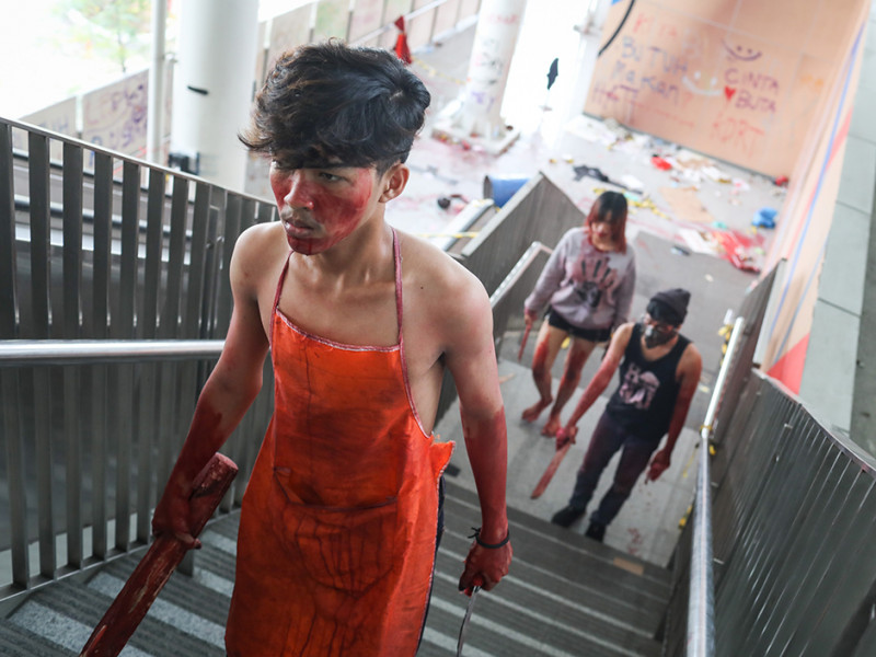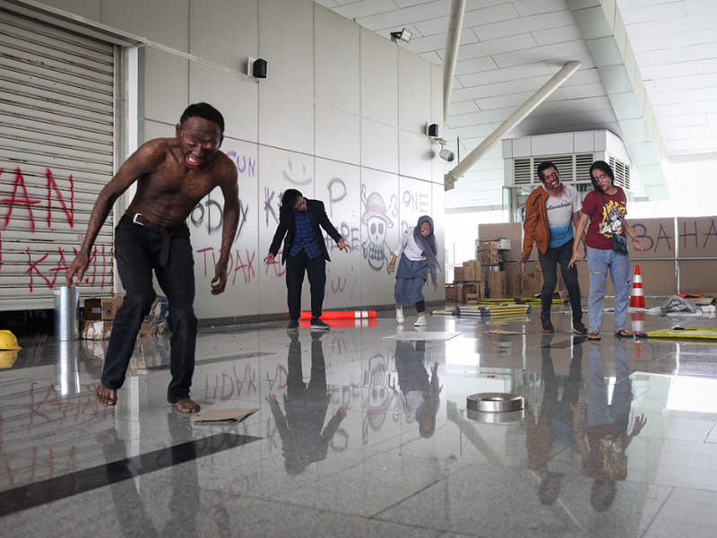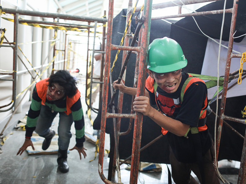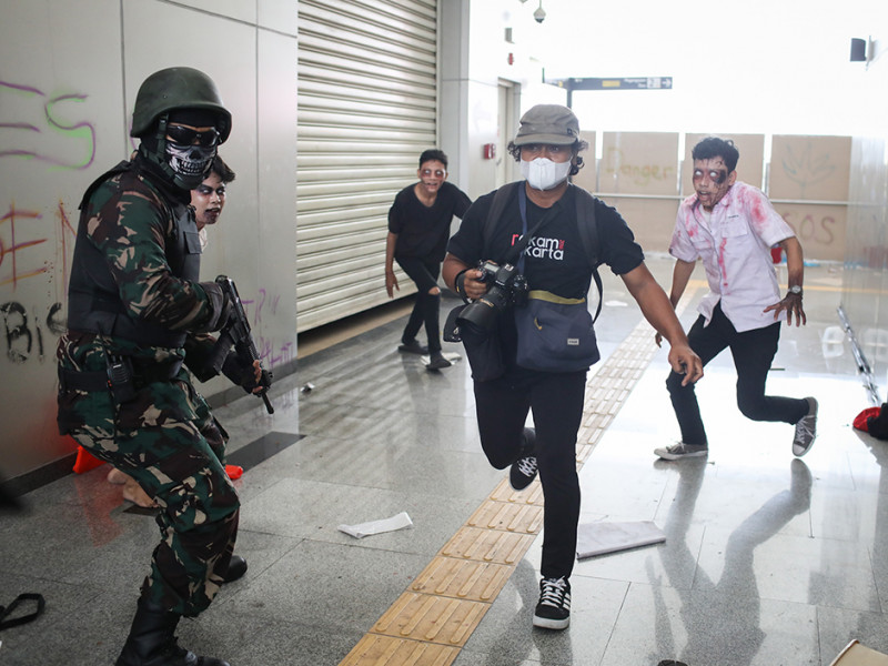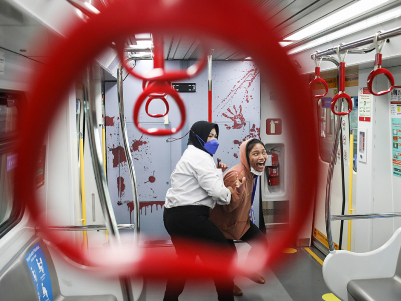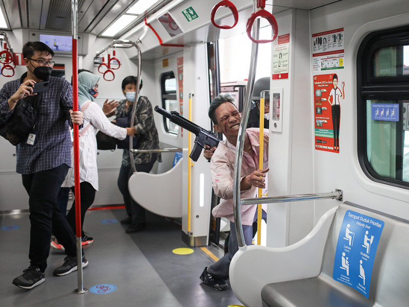 Sungguh menegangkan! Segerombolan mayat hidup atau zombie menginvasi Stasiun LRT Boulevard Utara dan Velodrome. Aksi kejar-kejaran pun tak terelakkan antara zombie dengan penumpang kereta layaknya adegan dalam film horor. PT LRT Jakarta bekerja sama dengan Pandora Box menggelar wahana Train to Apocalypse di dua stasiun LRT tersebut pada 5 Agustus sampai 11 September 2022. Train to Apocalypse merupakan atraksi kereta zombie pertama di Indonesia. Bagi kalian yang ingin menjajal wahana ini, cukup membeli tiket seharga Rp 60.000 untuk hari Senin-Jumat dan Rp 75.000 khusus akhir pekan. Berani mencoba? (Foto: Nugroho Sejati/beritajakarta.id)