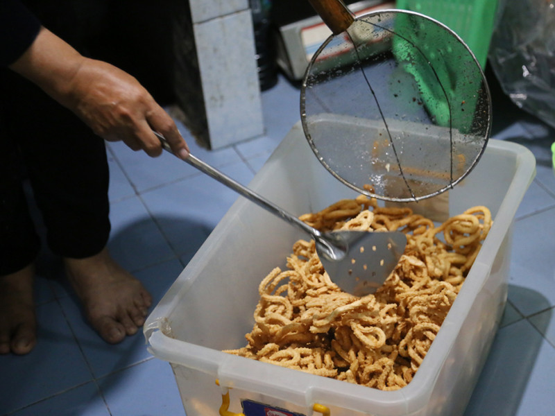 Kue akar kelapa merupakan salah satu penganan khas Betawi favorit banyak orang. Penamaan kue ini diambil dari bentuknya yang menyerupai akar pohon kelapa. Memiliki rasa gurih dan manis, kue akar kelapa cocok dijadikan camilan saat kumpul bersama keluarga ataupun teman. Bagi kalian yang ingin menikmati kerenyahan kue ini, bisa mencicipi kue akar kelapa buatan Ibu Rini. (Foto: Reza Hapiz/beritajakarta.id)