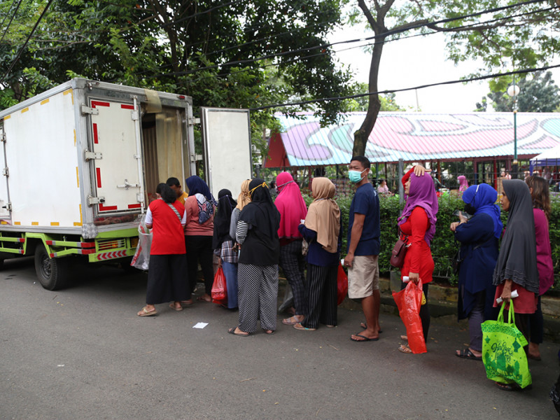 Ratusan warga Lenteng Agung memanfaatkan program pangan bersubsidi yang diadakan Suku Dinas Ketahanan Pangan, Kelautan dan Pertanian (KPKP) Jakarta Selatan. Distribusi pangan murah tersebut dlaksanakan di RPTRA Taman Lenteng Agung, Jalan Lenteng Agung Raya, Jagakarsa, Jakarta Selatan, Kamis (16/8). (Foto: Reza Hapiz/beritajakarta.id)