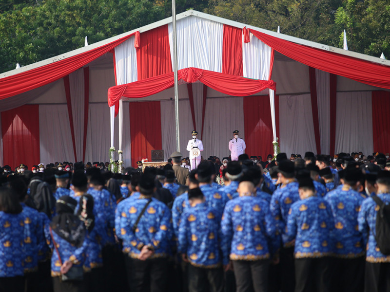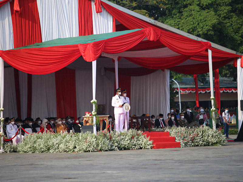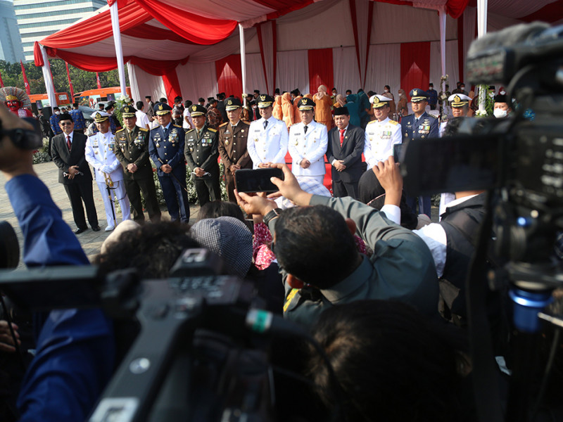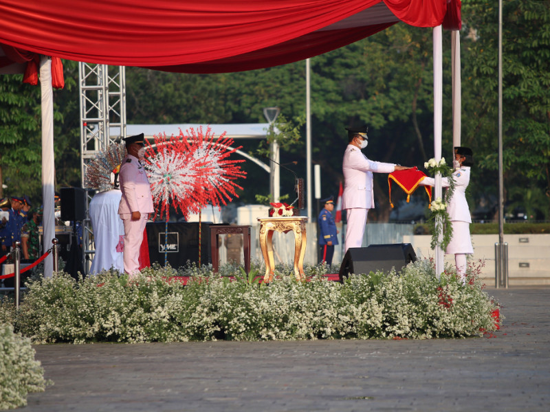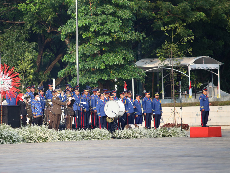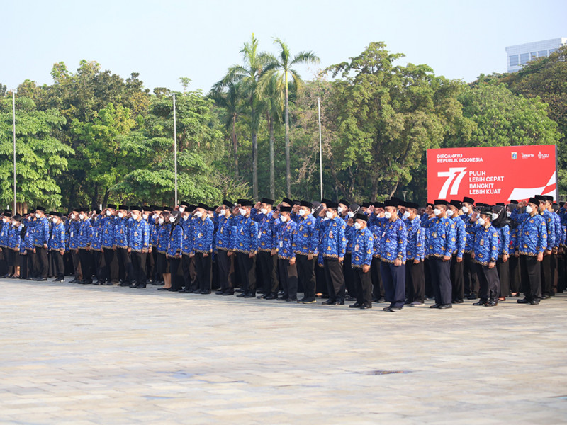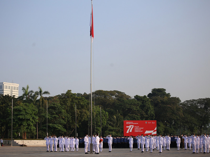 Dalam rangka memperingati Hut ke-77 Kemerdekaan Republik Indonesia, Pemerintah Provinsi (Pemprov) DKI Jakarta menggelar Upacara di Plaza Selatan Monas, Jakarta Pusat, Rabu (17/8). Adapun tema peringatan HUT Kemerdekaan Republik Indonesia kali ini adalah \"Pulih Lebih Cepat, Bangkit Lebih Kuat\". (Foto: Mochamad Tresna Suheryanto/beritajakarta.id)