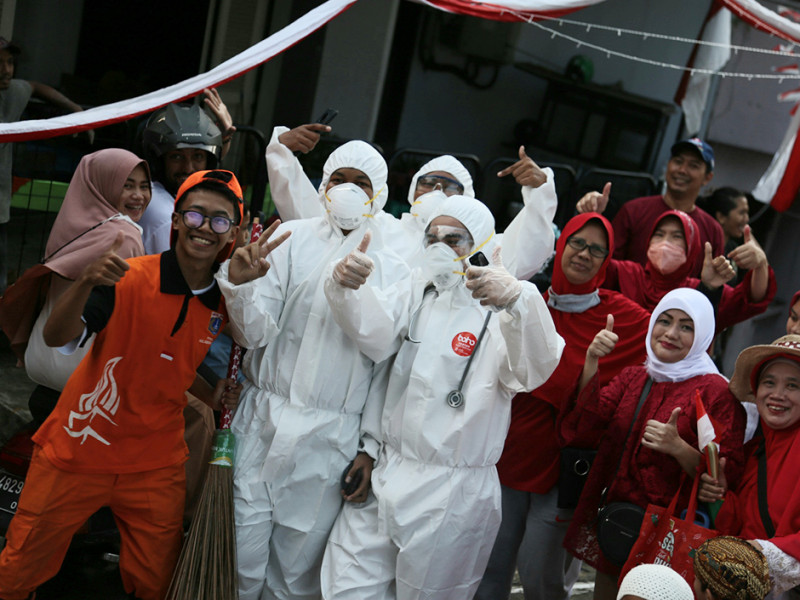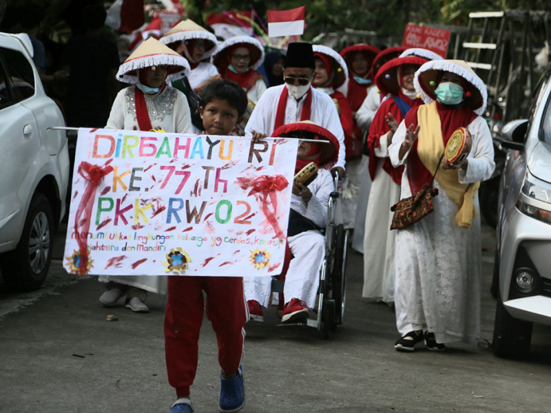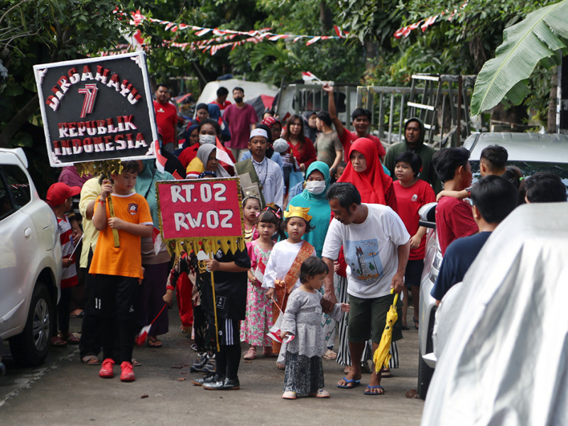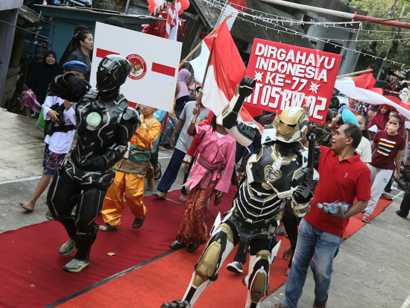 Peringatan HUT ke-77 Kemerdekaan RI di RW 02, Kelurahan Kebon Baru, Tebet, Jakarta Selatan diisi dengan kegiatan karnaval. Sejumlah warga tampil nyentrik mengenakan berbagai jenis kostum mulai dari pakaian tradisional, robot, hingga alat pelindung diri (APD). (Foto: Reza Hapiz/beritajakarta.id)