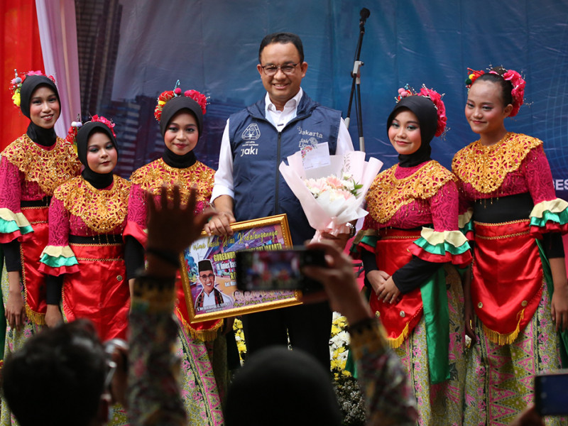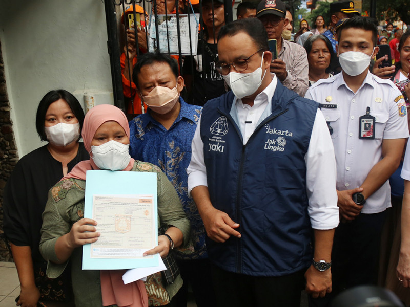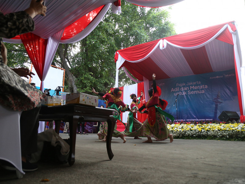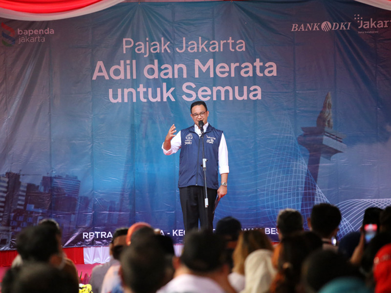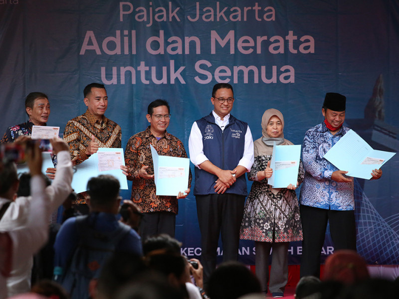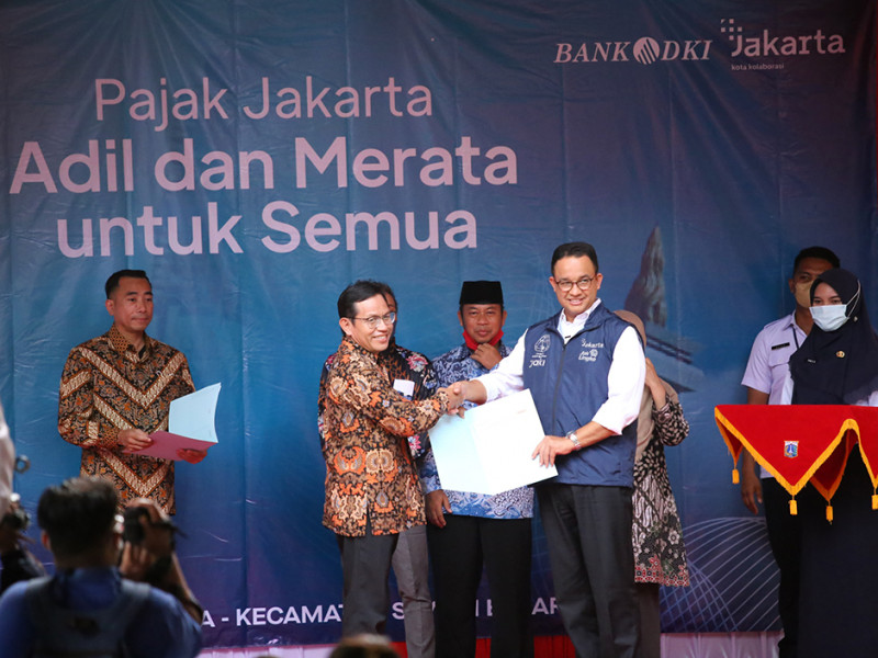 Pemerintah Provinsi (Pemprov) DKI Jakarta melalui Badan Pendapatan Daerah (Bapenda) melaksanakan program \"Pajak Jakarta Adil dan Merata untuk Semua\" di RPTRA Madusela, Sawah Besar, Jakarta Pusat, Rabu (17/8). Dalam kegiatan ini, Gubernur DKI Jakarta, Anies Baswedan melakukan penyerahan secara simbolis Surat Pemberitahuan Pajak Terutang Elektronik (e-SPPT) PBB-P2 2022 kepada 25 wajib pajak perwakilan masing-masing wilayah kota administrasi. (Foto: Mochamad Tresna Suheryanto/beritajakarta.id)