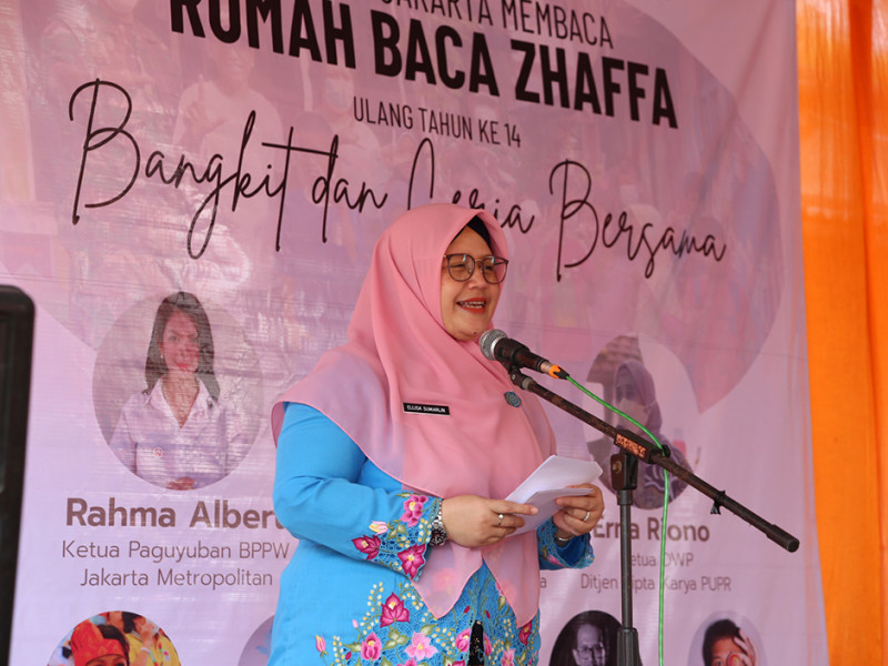 Wakil Ketua Bidang Pembinaan Karakter Keluarga TP PKK DKI Jakarta, Ellisa Sumarlin menerima bantuan 100 buku bacaan anak-anak dari Dharma Wanita Persatuan (DWP) Ditjen Cipta Karya Kementerian PUPR. Penyerahan dilakukan secara simbolis di Rumah Baca Zhaffa, Jalan Menara Air VII , Manggarai, Kecamatan Tebet, Jakarta Selatan, Rabu (24/8). (Foto: Reza Hapiz/beritajakarta.id)
