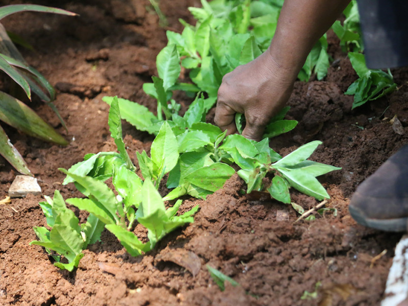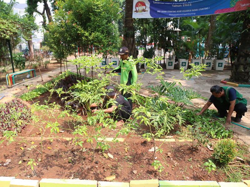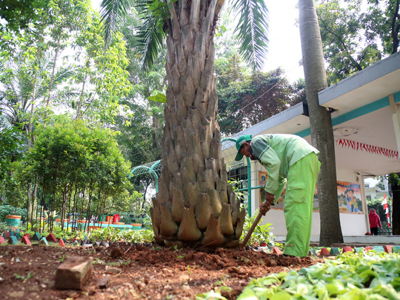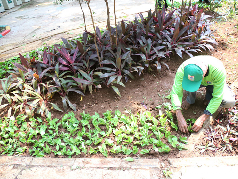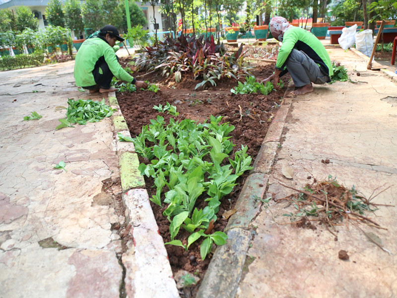Petugas Suku Dinas Pertamanan dan Hutan Kota (Sudin Tamhut) Jakarta Pusat melakukan penataan tanaman di Ruang Publik Terpadu Ramah Anak (RPTRA) Amir Hamzah, Jalan Taman Matraman Timur, Kelurahan Pegangsaan, Menteng, Rabu (24/8). (Foto: Mochamad Tresna Suheryanto/beritajakarta.id)