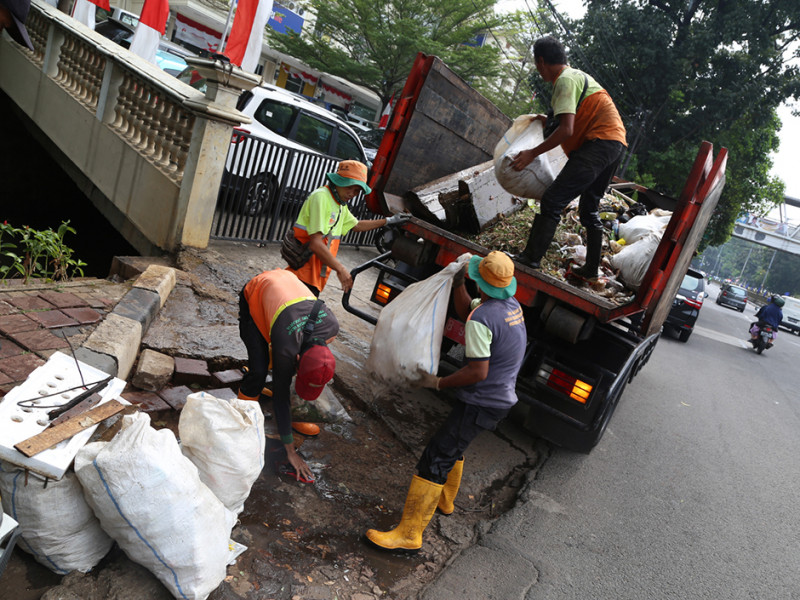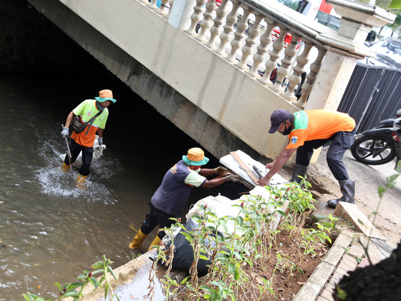 Unit Pelaksana Kebersihan (UPK) Badan Air, Dinas Lingkungan Hidup DKI Jakarta melakukan pengangkatan sampah di Kali Baru Barat, Jalan Prof Dr Soepomo, Tebet, Jakarta Selatan. Pembersihan dilakukan agar aliran air tetap lancar. (Foto: Reza Hapiz/beritajakarta.id)