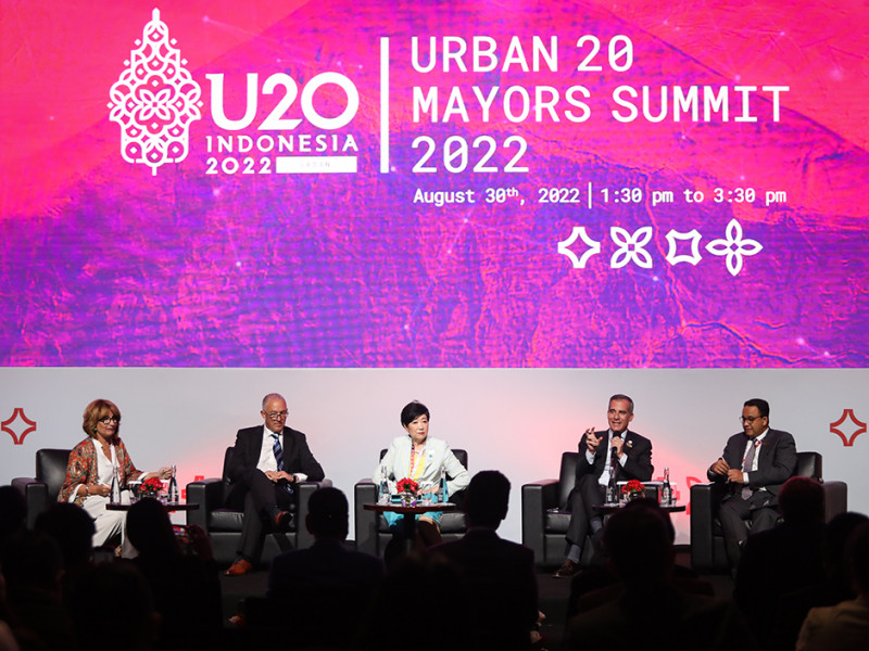 Gubernur DKI Jakarta, Anies Baswedan mengikuti diskusi pleno U20 Mayors Summit 2022 di Ballroom Hotel Fairmont Jakarta, Tanah Abang, Jakarta Pusat, Selasa (30/8). Diskusi bertajuk \'Cities for All, Cities for the Future: Achieving Inclusive and Sustainable Housing, Mobility, and Energy in Urban Areas\' itu dihadiri oleh Gubernur Tokyo, Wali Kota Rotterdam, Wali Kota Los Angeles, serta Wali Kota London yang hadir secara virtual. (Foto: Nugroho Sejati/beritajakarta.id)