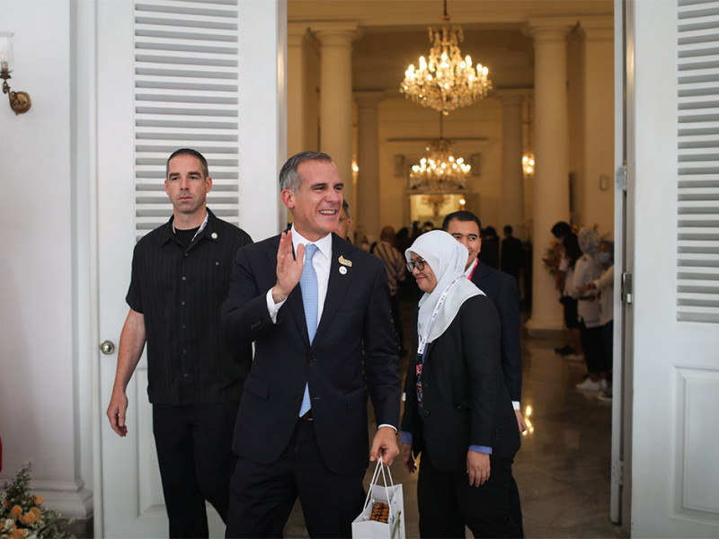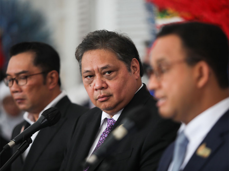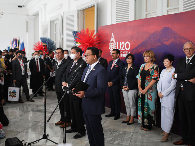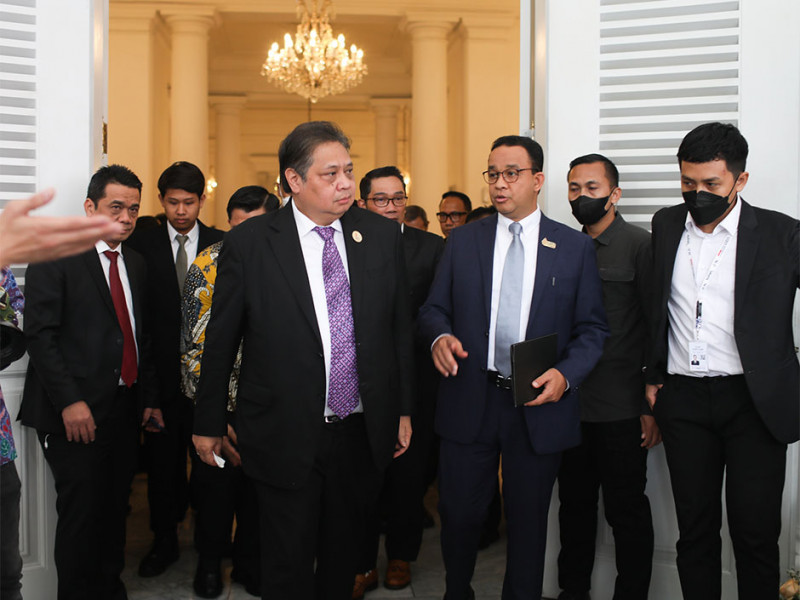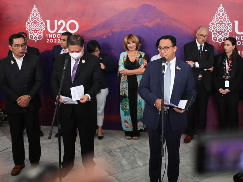 Gubernur DKI Jakarta sekaligus Co-chairs U20 2022, Anies Baswedan menyerahkan U20 Communique kepada Menteri Koordinator (Menko) Perekonomian Republik Indonesia, Airlangga Hartarto di Balai Kota DKI Jakarta, Gambir, Jakarta Pusat, Rabu (31/8). U20 Communique akan disampaikan kepada Presiden Joko Widodo untuk dibahas pada pertemuan KTT G20 di Bali. (Foto: Nugroho Sejati/beritajakarta.id)
