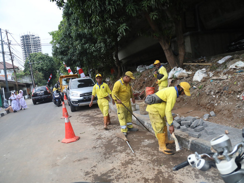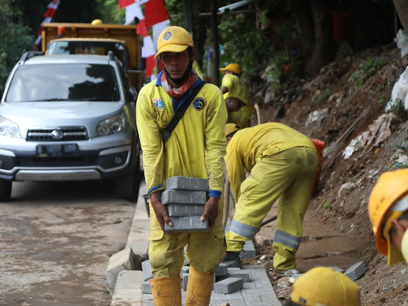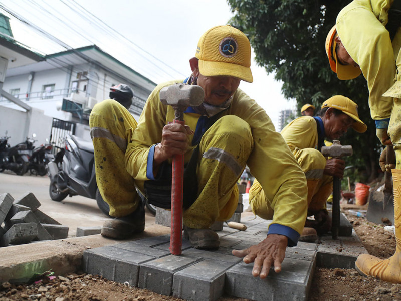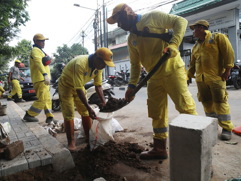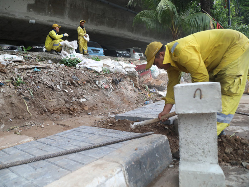 Satuan Pelaksana (Satpel) Bina Marga Kecamatan Menteng, Jakarta Pusat, melakukan perbaikan trotoar di Jalan Anyer, Kelurahan Menteng, Kamis (1/9). Penataan dilakukan untuk menjaga kenyamanan dan keamanan pejalan kaki. (Foto: Mochamad Tresna Suheryanto/beritajakarta.id)