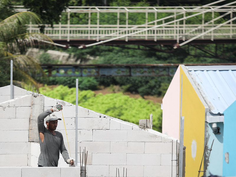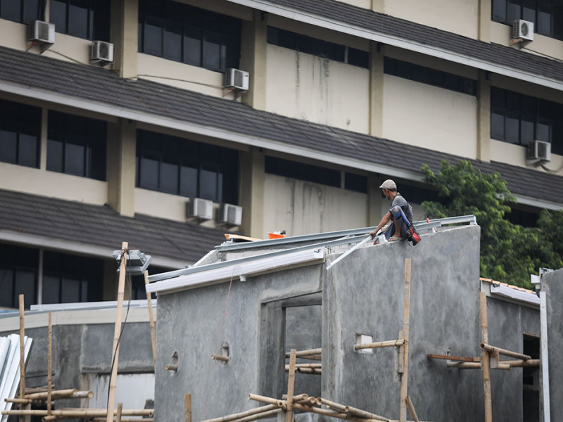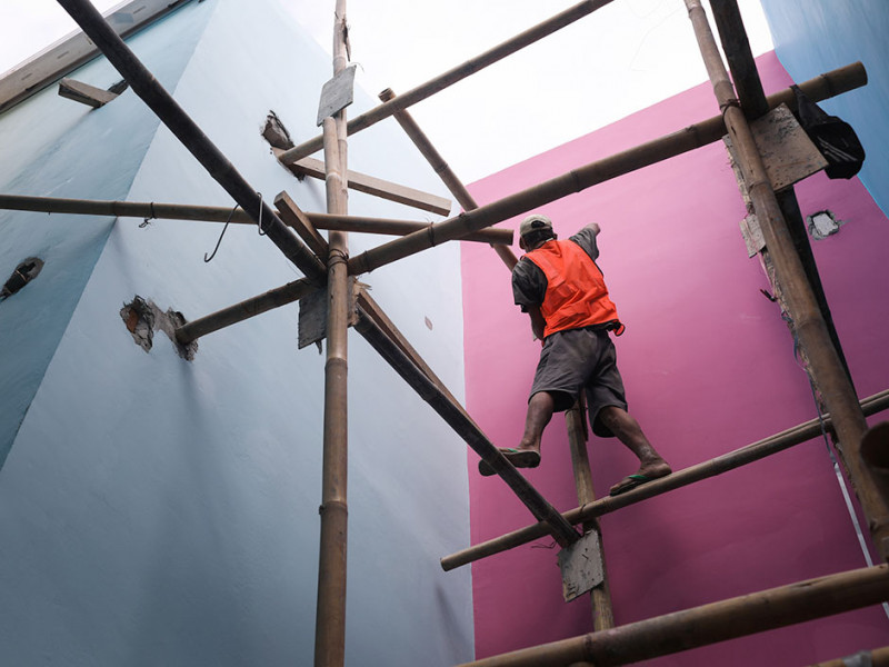 Progres pembangunan Kampung Gembira Gembrong di Jalan Basuki Rahmat, Cipinang Besar Utara, Jatinegara, Jakarta Timur telah mencapai 80 persen. Para pekerja, Jumat (2/9), masih terus menyelesaikan pembangunan yang ditargetkan rampung September 2022. (Foto: Nugroho Sejati/beritajakarta.id)
