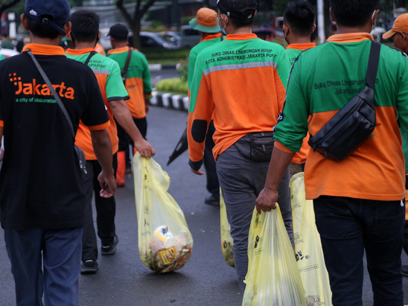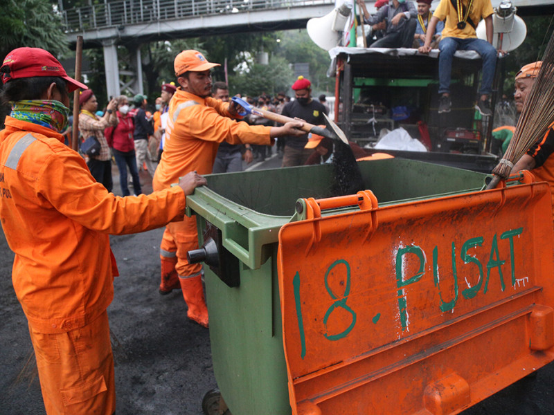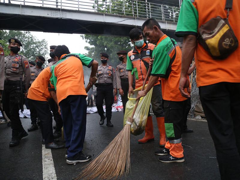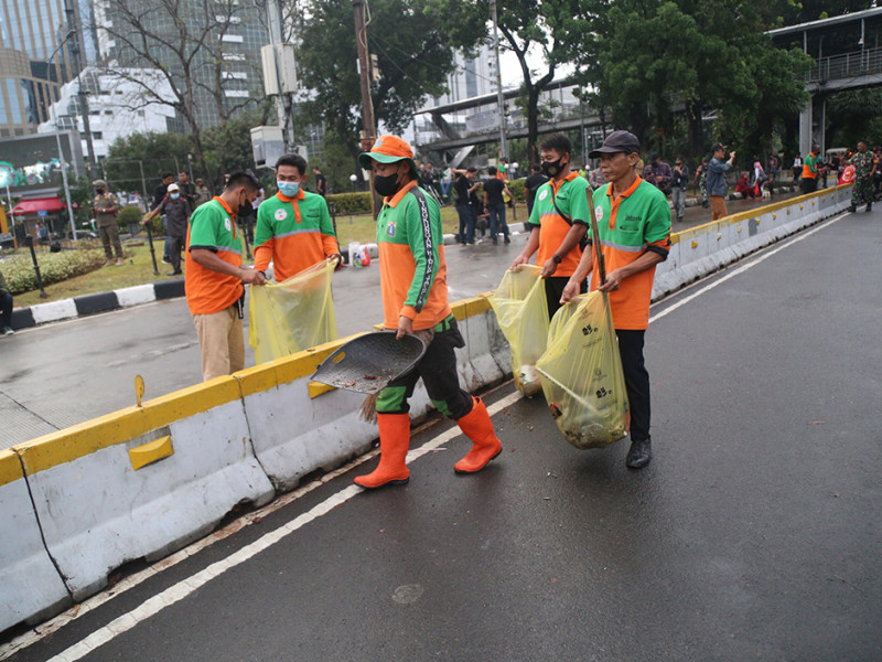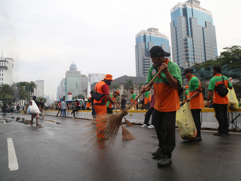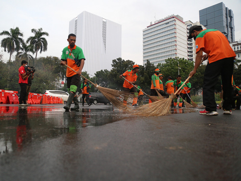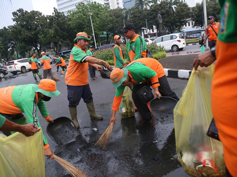 Personel Satuan Pelaksana Lingkungan Hidup (Satpel LH) Kecamatan Gambir, Jakarta Pusat melakukan pembersihan di Jalan MH Thamrin. Kegiatan ini dilakukan pasca aksi penyampaian pendapat di kawasan Patung Kuda Arjuna Wiwaha pada Kamis (8/9). (Foto: Mochamad Tresna Suheryanto/beritajakarta.id)