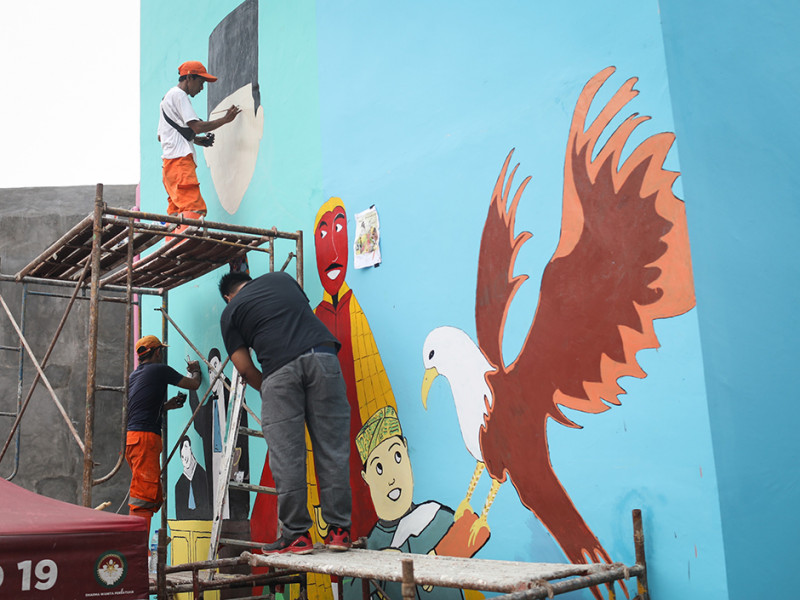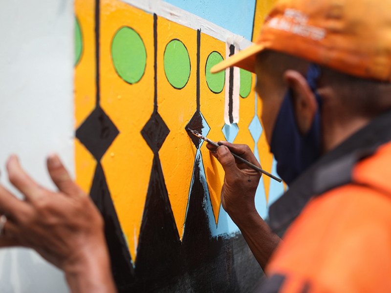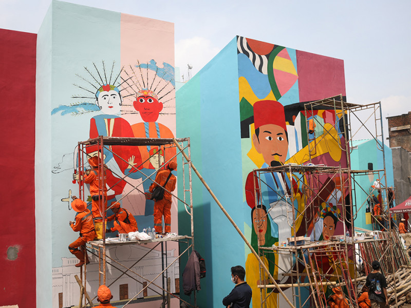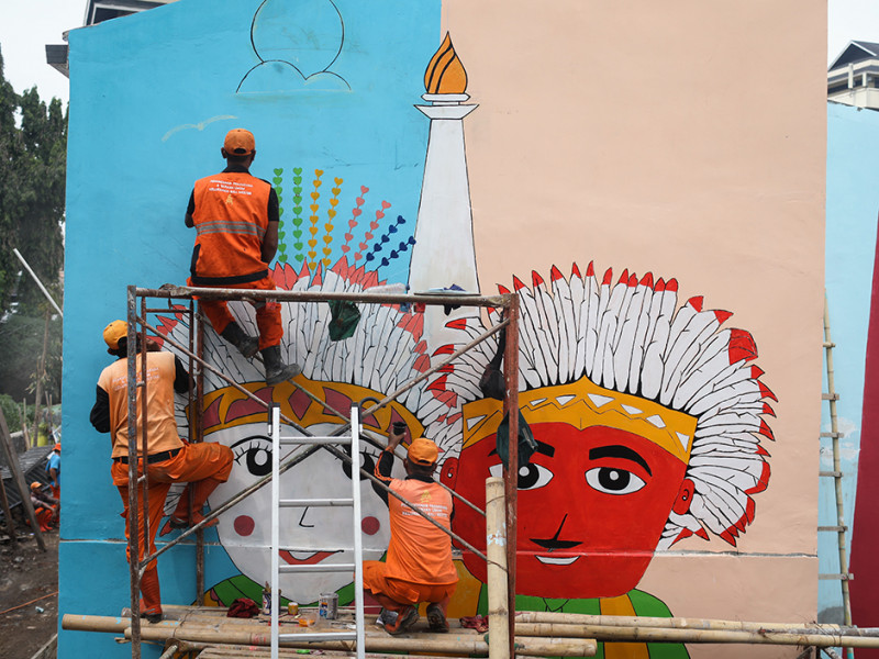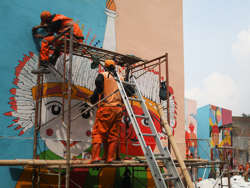 Kampung Gembira Gembrong, Jatinegara, Jakarta Timur dibikin makin cantik dengan sentuhan mural. Pembuatan mural bertema Jakarta tersebut dilakukan oleh petugas Penanganan Prasarana dan Sarana Umum (PPSU) se-kecamatan Jatinegara. (Foto: Nugroho Sejati/beritajakarta.id)