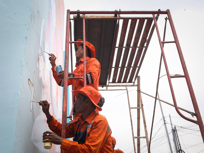 Petugas PPSU Gabungan Lukis Mural di Kampung Gembira Gembrong