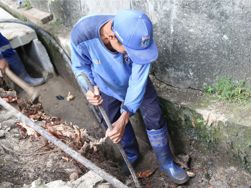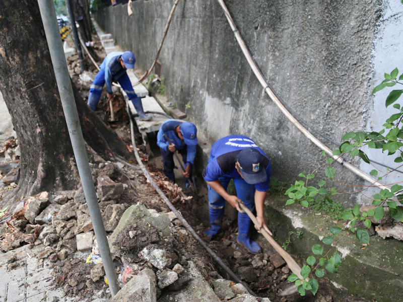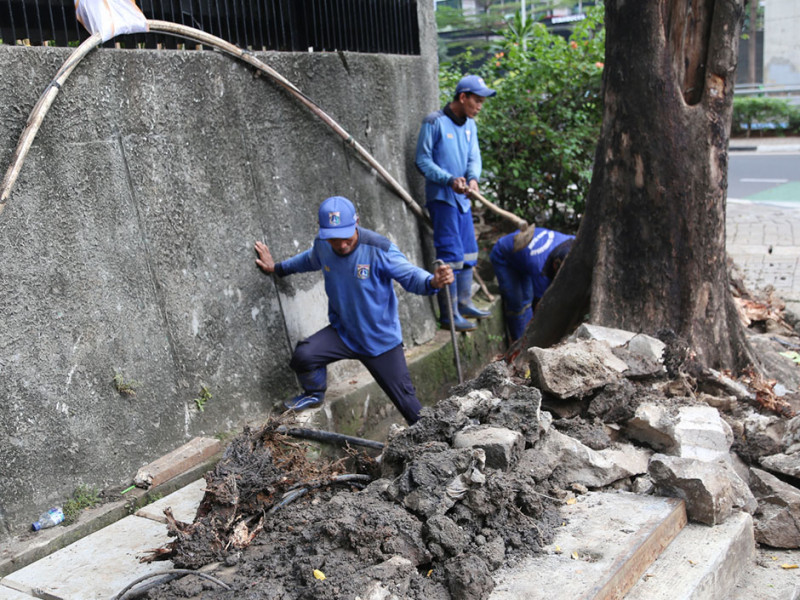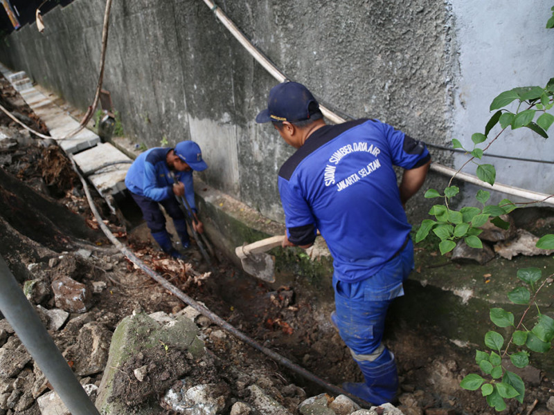 Satuan Pelaksana Sumber Daya Air (Satpel SDA) Kecamatan Setiabudi, Jakarta Selatan, Kamis (15/9), melakukan perbaikan saluran di Jalan Denpasar Raya, Kelurahan Karet Kuningan. Perbaikan ditargetkan rampung dalam waktu satu minggu ke depan. (Foto: Reza Hapiz/beritajakarta.id)