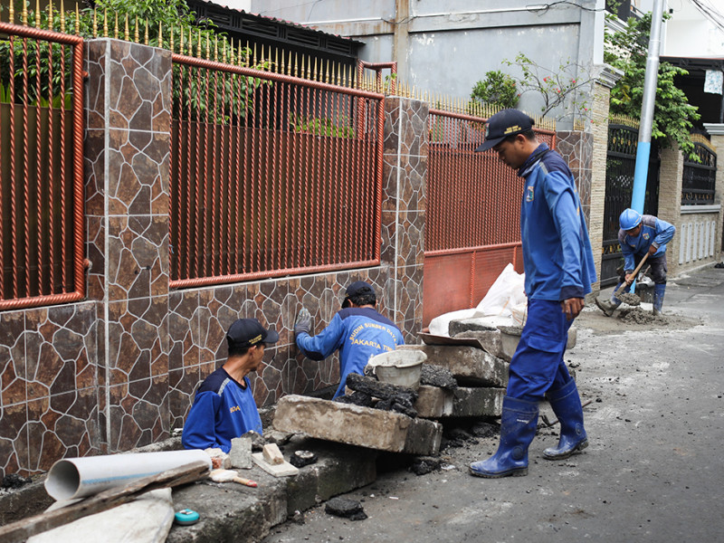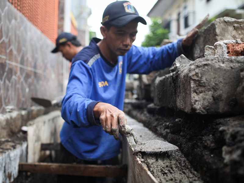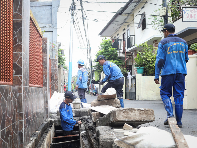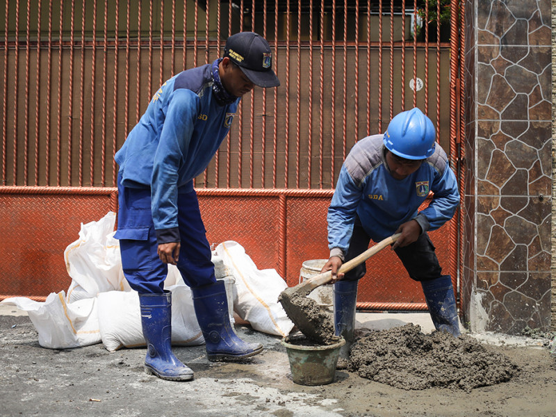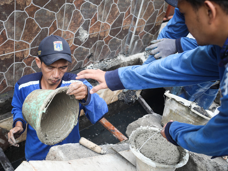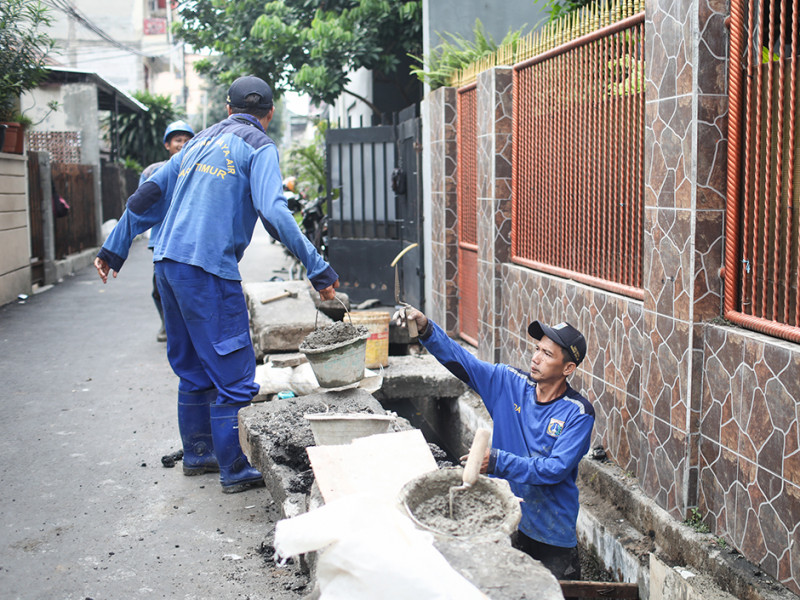 Satuan Pelaksana Sumber Daya Air (Satpel SDA) Kecamatan Pulo Gadung, Jakarta Timur melakukan peninggian turap saluran air di Jalan Rawamangun Tegalan, RT 04/02, Kelurahan Rawamangun. Ketinggian saluran yang semula 50 sentimeter ditambah menjadi 80 sentimeter. (Foto: Nugroho Sejati/beritajakarta.id)