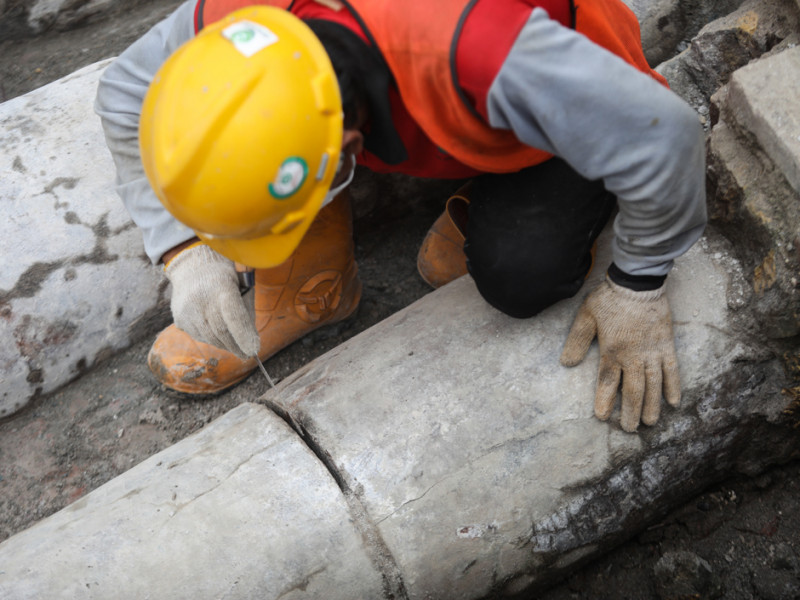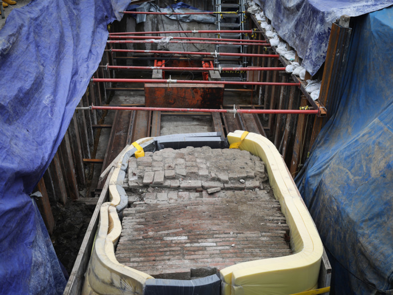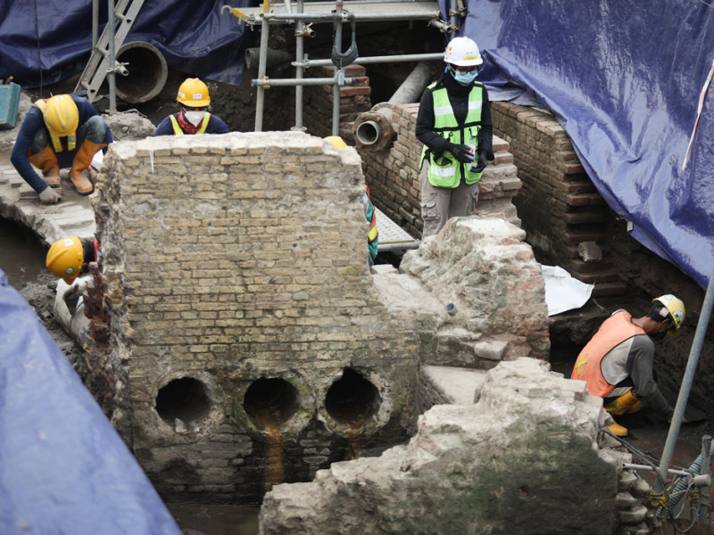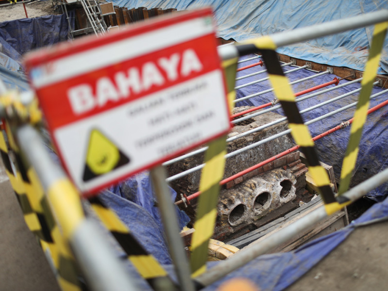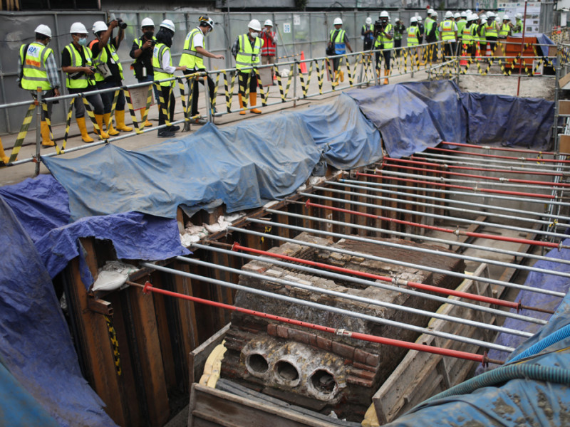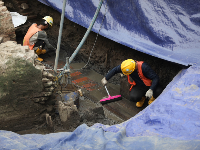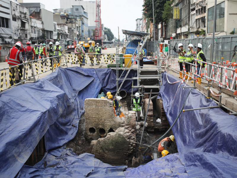Objek Diduga Cagar Budaya (ODCB) berupa Saluran Air Kuno Batavia ditemukan di proyek pembangunan Stasiun MRT Glodok, Taman Sari, Jakarta Barat . PT MRT Jakarta berkomitmen untuk melestarikan temuan objek bersejarah tersebut yang nantinya akan dipamerkan untuk mengedukasi masyarakat. (Foto: Nugroho Sejati/beritajakarta.id)