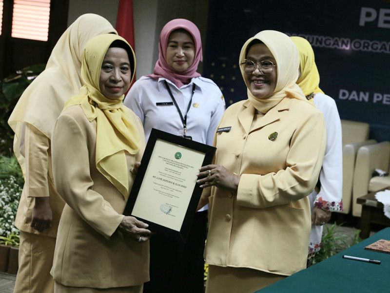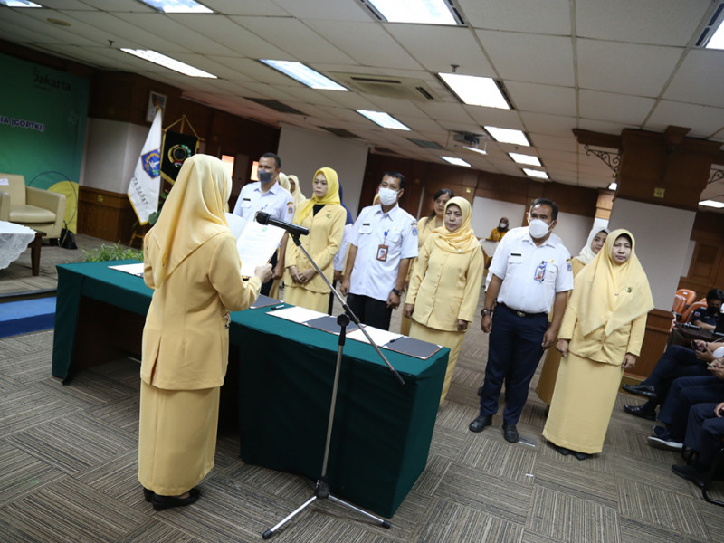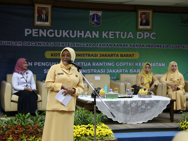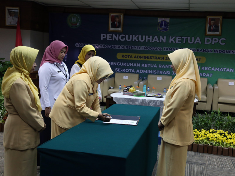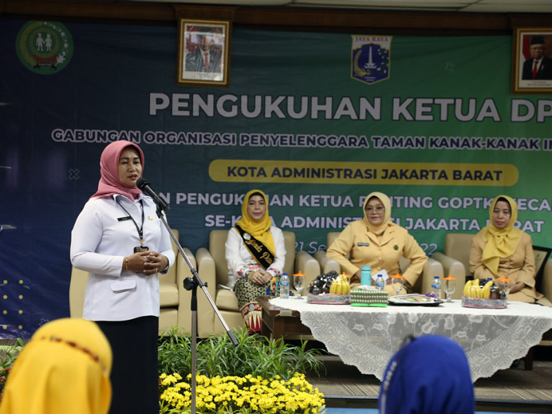 Ketua Pengurus Dewan Pimpinan Cabang Gabungan Organisasi Penyelenggara Taman Kanak-kanak Indonesia (DPC GOPTKI) Kota Jakarta Barat dan Ketua Ranting GOPTKI Kecamatan se-Jakarta Barat, resmi dikukuhkan. Pengukuhan dilakukan langsung Ketua GOPTKI Provinsi DKI Jakarta, Komariah Marullah di ruang Wijaya Kusuma, Kantor Wali Kota Jakarta Barat, Rabu (21/9). (Foto: Reza Hapiz/beritajakarta.id)