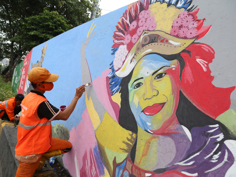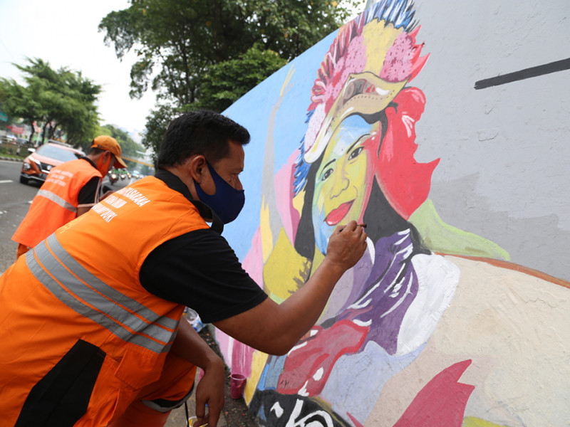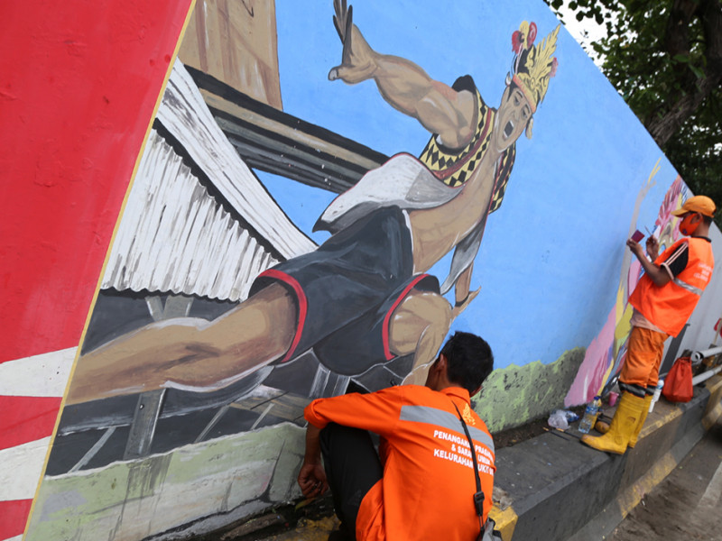 Petugas Penanganan Prasarana dan Sarana Umum (PPSU) Kelurahan Bukit Duri mempercantik lingkungan dengan menggambar mural di dinding Flyover Tebet, Jalan Abdullah Syafei, Jakarta Selatan, Sabtu (24/9). (Foto: Reza Hapiz/beritajakarta.id)