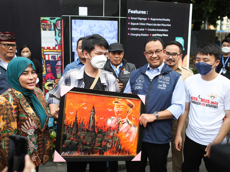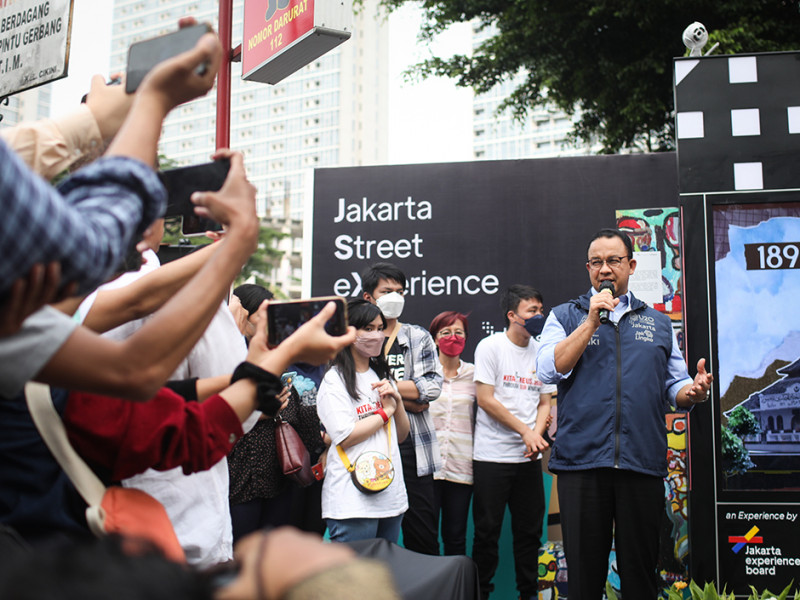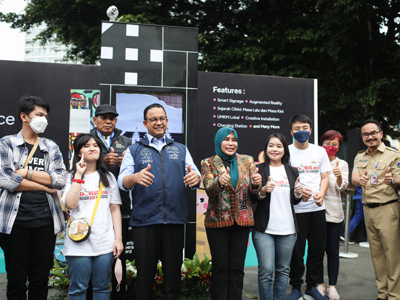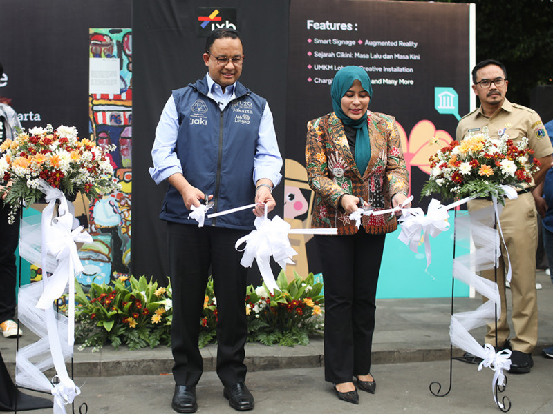 Gubernur DKI Jakarta, Anies Baswedan, bersama Direktur Utama PT Jakarta Tourisindo/Jakarta Experience Board (JXB), Novita Dewi, meluncurkan Jakarta Street Experience (JSX) di Jalan Cikini Raya, Menteng, Jakarta Pusat, Senin (26/9). JSX merupakan smart signage, berupa instalasi interaktif yang menggabungkan unsur edukasi, informasi, seni dan teknologi. Para pejalan kaki akan mendapatkan pengalaman baru, informasi baru, hingga keunikan dari setiap perjalanan. (Foto: Nugroho Sejati/beritajakarta.id)