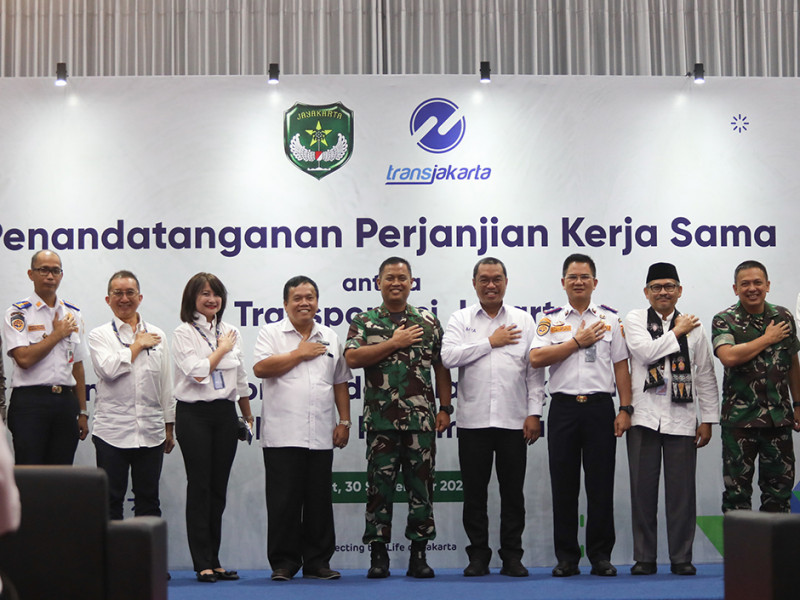 PT Transportasi Jakarta (Transjakarta) menandatangani perjanjian kerja sama dengan Tentara Nasional Indonesia Angkatan Darat (TNI AD) di Kantor PT Transjakarta, Jalan Mayjen Sutoyo, Makasar, Jakarta Timur, Jumat (30/9). Kerja sama tersebut meliputi tiga hal penting, yakni sumber daya manusia (SDM), pendidikan, dan pengelolaan aset. (Foto: Nugroho Sejati/beritajakarta.id)