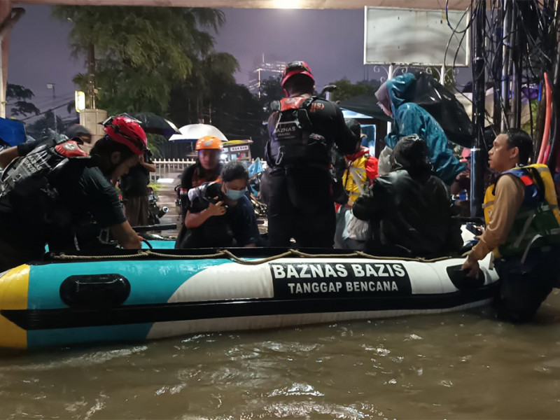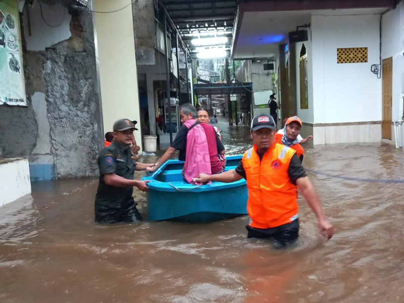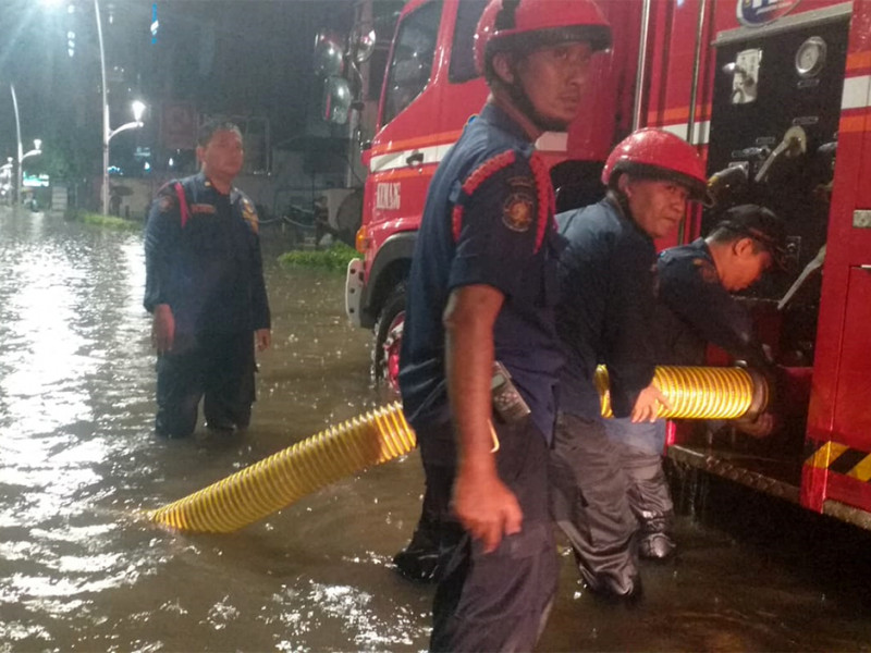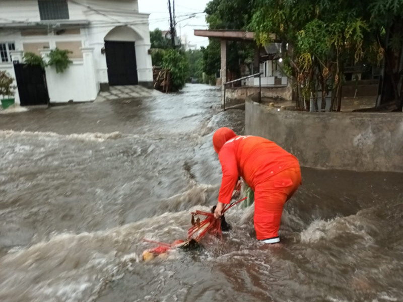 Petugas lintas Organisasi Perangkat Daerah (OPD) melakukan penanganan genangan di wilayah Jakarta Selatan, Selasa (4/10). Penanganan yang dilakukan meliputi penyedotan genangan, pembersihan tali air, hingga evakuasi warga yang melintas. (Foto: Reza Hapiz/beritajakarta)