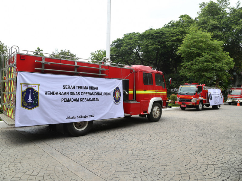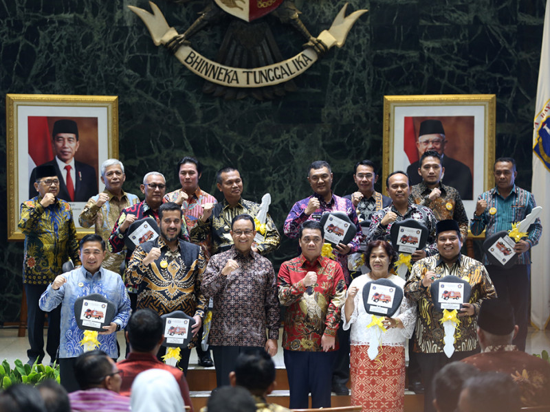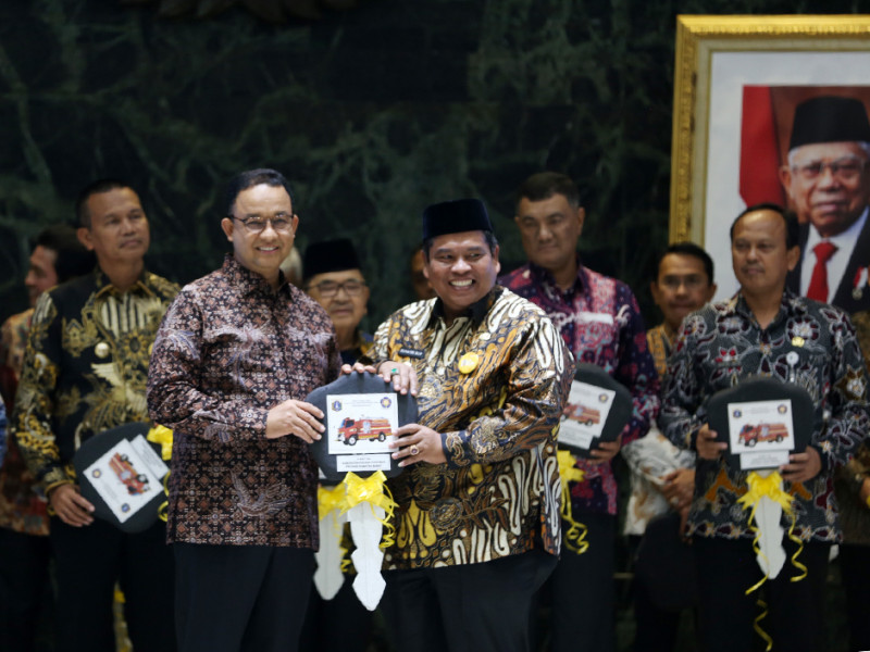 Gubernur DKI Jakarta, Anies Baswedan melakukan penandatanganan kesepakatan bersama antar pemerintah daerah sekaligus serah terima hibah Kendaraan Dinas Operasional (KDO) pemadam kebakaran di Balai Kota DKI Jakarta, Rabu (5/10). Dalam kegiatan ini Pemerintah Provinsi (Pemprov) DKI menjalin kerja sama dengan 11 pemerintah daerah terkait pengembangan potensi daerah serta pelayanan publik dan menghibahkan KDO pemadam kebakaran kepada 14 pemerintah daerah. (Foto: Reza Hapiz/beritajakarta.id)