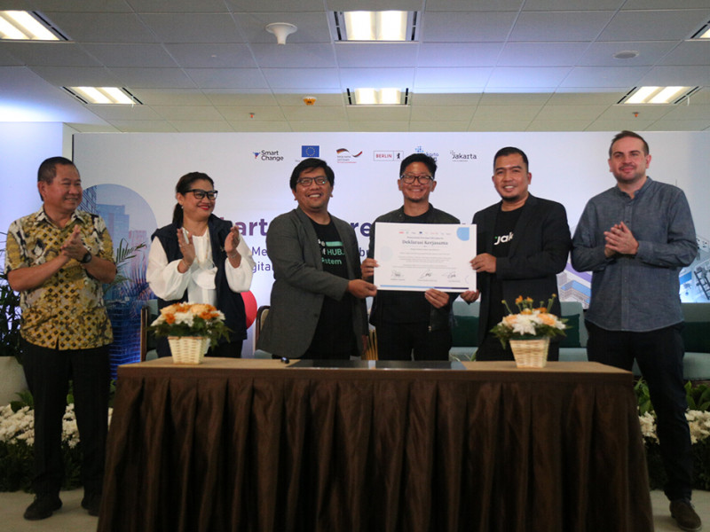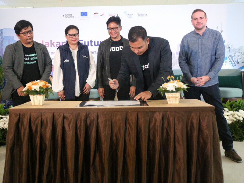 Badan Layanan Umum Daerah Jakarta Smart City (BLUD JSC) bersama Gerakan Nasional 1.000 Startup Digital dan HUB.ID Kemkominfo menggelar deklarasi kerja sama di Jakarta Future City Hub, Gedung Jakarta Box (JB) Tower, Gambir, Jakarta Pusat, Kamis (6/10). Deklarasi ini dilakukan Kepala BLUD JSC, Yudhistira Nugraha bersama Koordinator Gerakan Nasional 1.000 Startup Digital, Sonny Sudaryana dan Ketua Tim Business Matchmaking Ditjen Aptika Kemenkominfo dan Smart Change Project, Luat Sihombing. (Foto: Mochamad Tresna Suheryanto/beritajakarta.id)