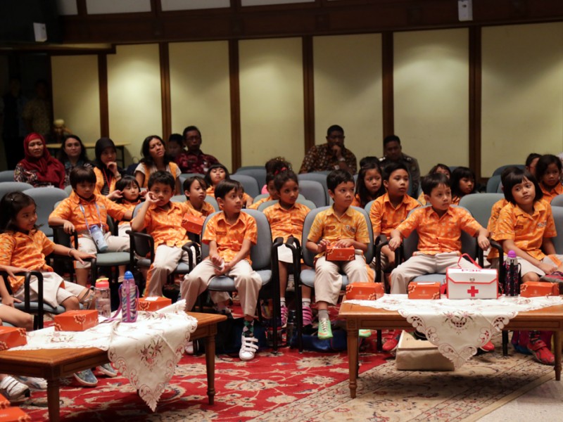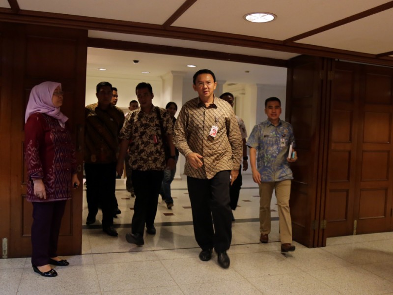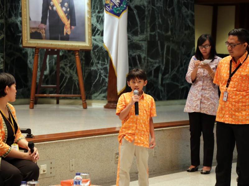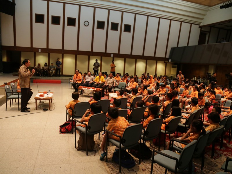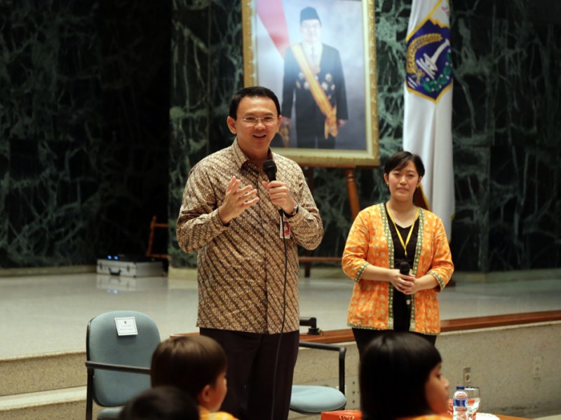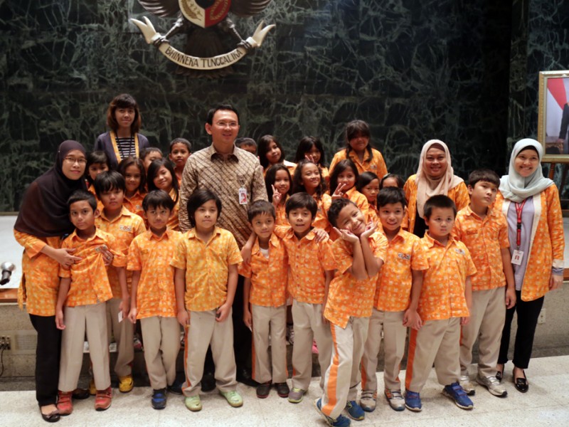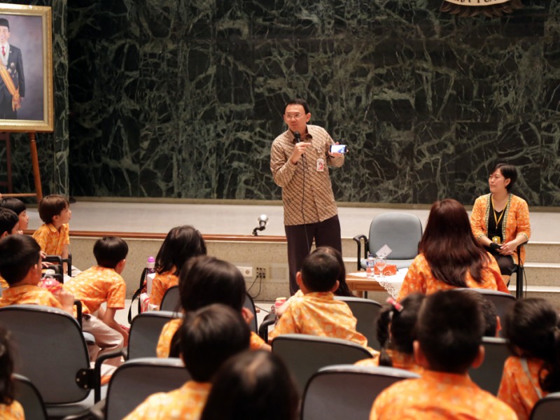 Gubernur DKI Jakarta, Basuki Tjahaja Purnama menerima kunjungan siswa kelas 2 Sekolah Cikal di Balaikota DKI Jakarta, Kamis (28/05/2015). Dalam kesempatan tersebut Basuki memberikan motivasi dan informasi terkait sejarah, transportasi dan sistem pemerintahan di DKI Jakarta. (Foto : Reza/Beritajakarta.com)