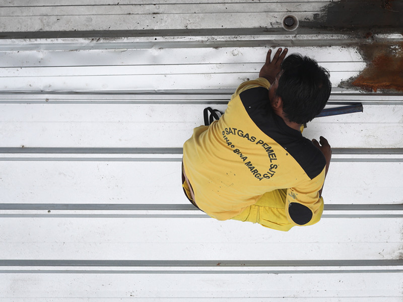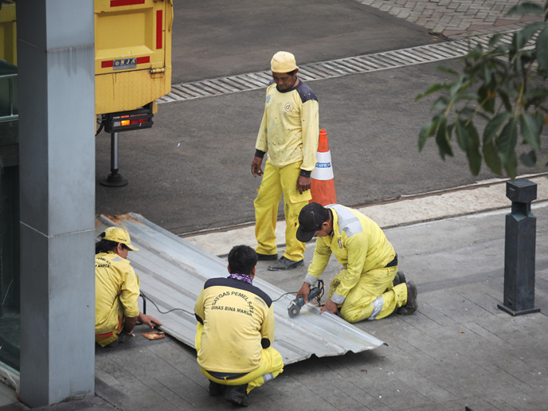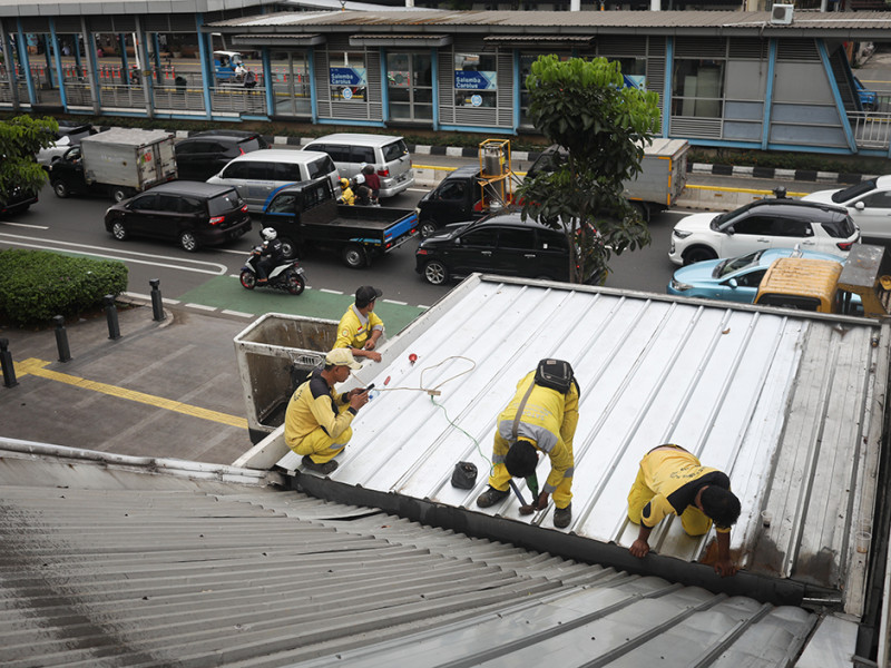 Petugas Suku Dinas Bina Marga Jakarta Pusat memperbaiki atap jembatan penyeberangan orang (JPO) Salemba Capitol Park Carolus di Jalan Salemba Raya, Kecamatan Senen, Jakarta Pusat. Perbaikan dilakukan karena adanya kebocoran di atap tangga JPO yang juga menghubungkan Halte Transjakarta Salemba Carolus tersebut. (Foto: Nugroho Sejati/beritajakarta.id)