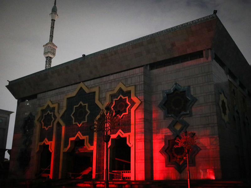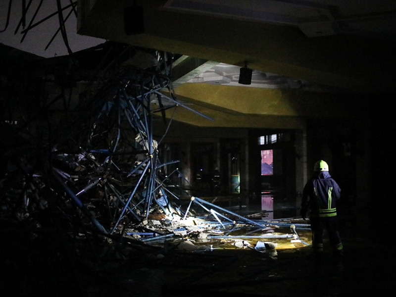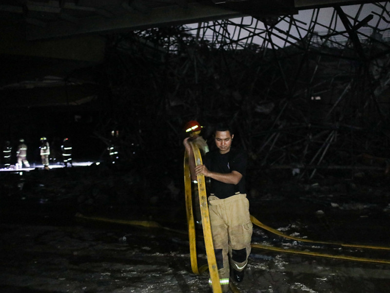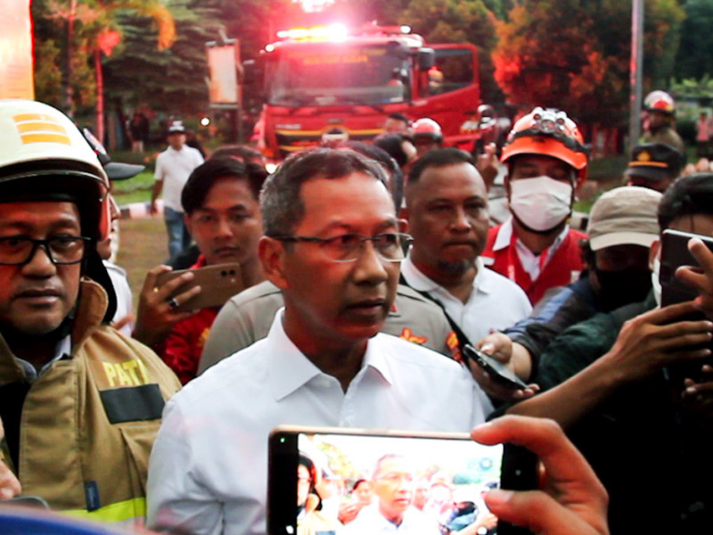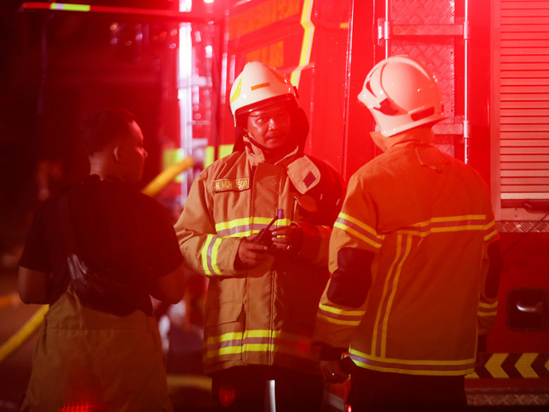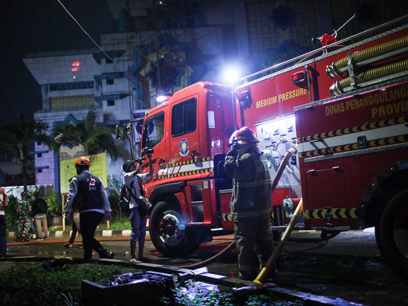 Petugas Dinas Penanggulangan Kebakaran dan Penyelamatan (Gulkarmat) DKI Jakarta memadamkan kebakaran kubah Masjid Jakarta Islamic Center (JIC) di Jalan Kramat Raya, Koja, Jakarta Utara, Rabu (19/10). Sebanyak 21 unit mobil pemadam kebakaran dan 90 personel dikerahkan untuk memadamkan api. Tidak ada korban jiwa maupun luka berat dalam kejadian ini. (Foto: Nugroho Sejati/beritajakarta.id)