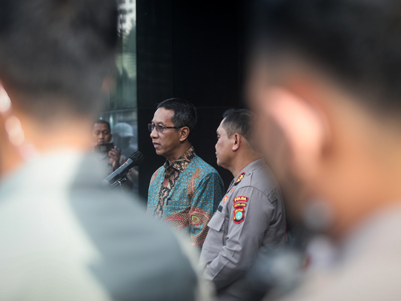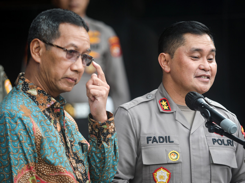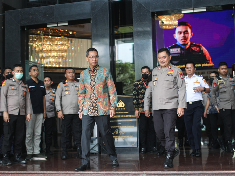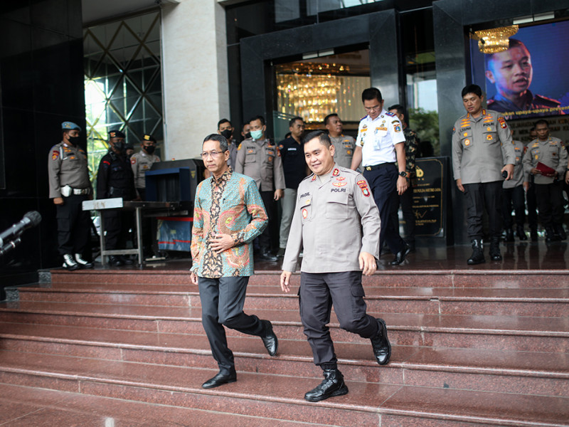 Penjabat (Pj) Gubernur DKI Jakarta, Heru Budi Hartono menemui Kapolda Metro Jaya, Irjen Pol Mohammad Fadil Imran di Gedung Promoter Polda Metro Jaya, Kebayoran Baru, Jakarta Selatan, Kamis (20/10). Pertemuan keduanya dalam rangka memperkuat sinergitas antara Pemprov DKI Jakarta dengan Polda Metro Jaya guna menciptakan situasi kondusif di Jakarta. (Foto: Nugroho Sejati/beritajakarta.id)