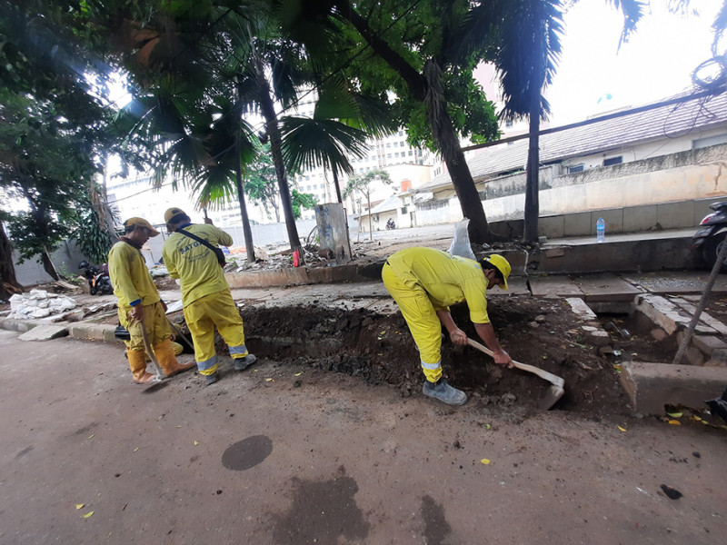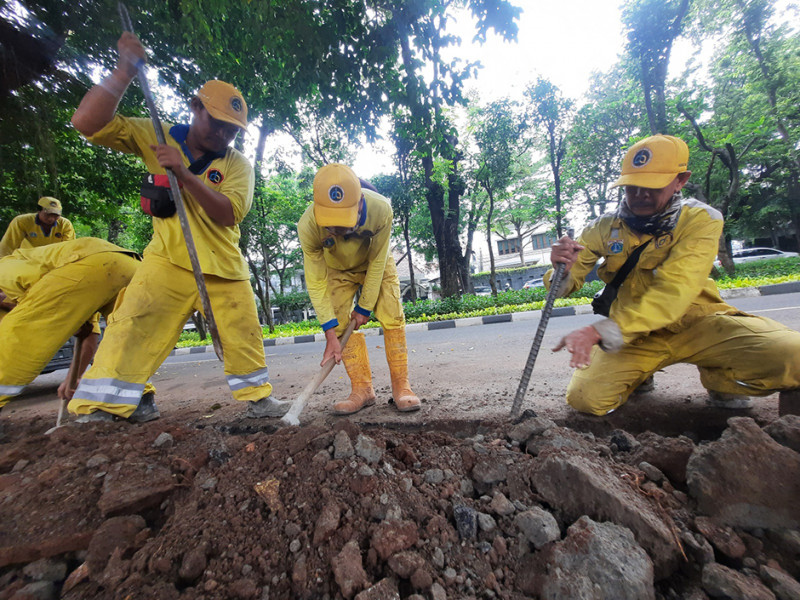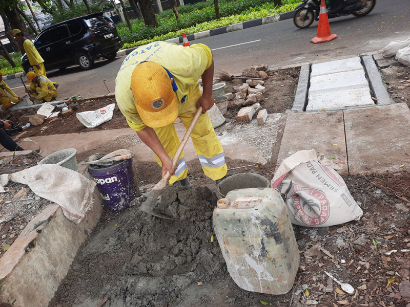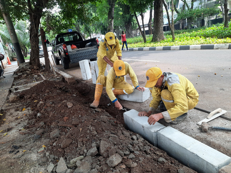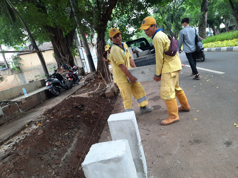 Satuan Pelaksana (Satpel) Bina Marga Kecamatan Menteng, Jakarta Pusat melakukan perbaikan kanstin di Jalan Sutan Syahrir, Kelurahan Gondangdia. Perbaikan dilakukan lantaran kondisi kanstin yang mengalami kerusakan ataupun lepas. (Foto: Reza Hapiz/beritajakarta.id)