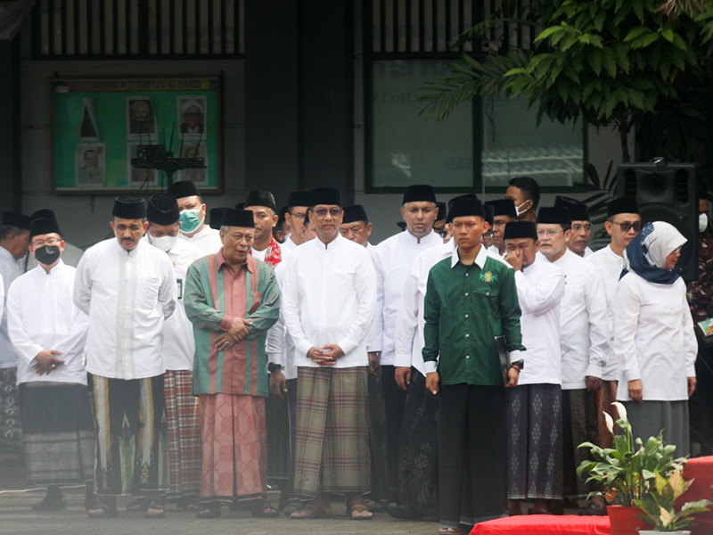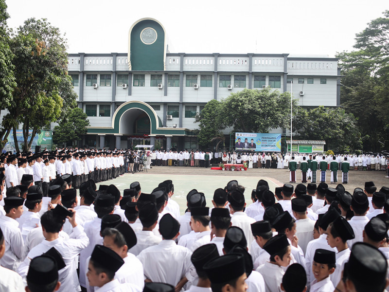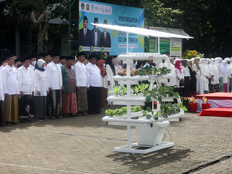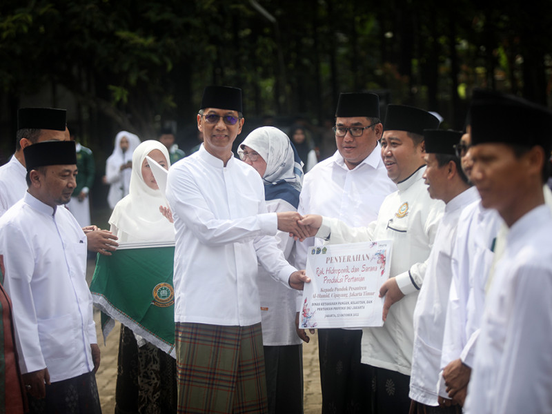 Penjabat (Pj) Gubernur DKI Jakarta, Heru Budi Hartono, menyerahkan bantuan secara simbolis sarana pertanian perkotaan (urban farming) kepada perwakilan pesantren di Pondok Pesantren Al-Hamid, Cipayung, Jakarta Timur, Sabtu (22/10). Pemberian sarana urban farming berupa rak instalasi hidroponik beserta bibit tanaman tersebut dalam rangka peringatan Hari Santri Tahun 2022. (Foto: Nugroho Sejati/beritajakarta.id)