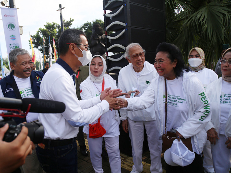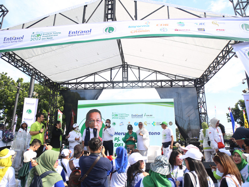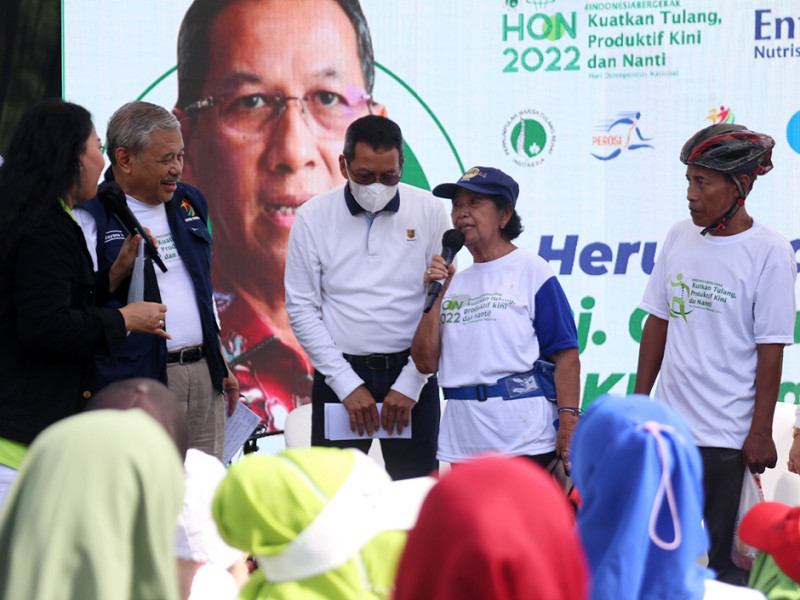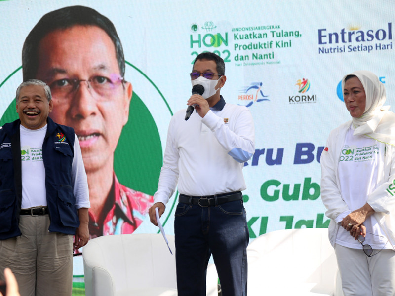 Pemerintah Provinsi (Pemprov) bersama Kementerian Kesehatan RI menggelar peringatan Hari Osteoporosis Nasional (HON) 2022 di Plaza Utara Gelora Bung Karno (GBK), Senayan, Jakarta Pusat, Minggu (23/10). Acara bertajuk \"Indonesia Bergerak: Kuatkan Tulang, Produktif Kini dan Nanti\" tersebut turut dihadiri Penjabat (PJ) Gubernur DKI Jakarta, Heru Budi Hartono. (Foto: Mochamad Tresna Suheryanto/beritajakarta.id)
