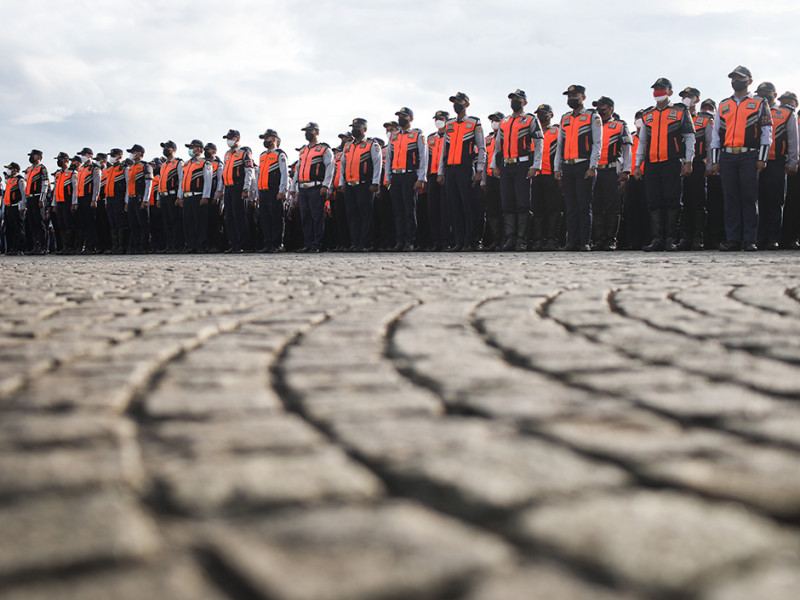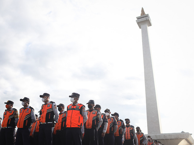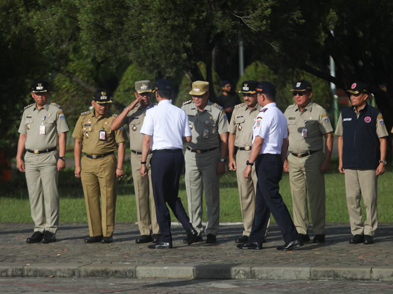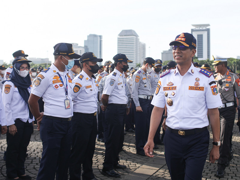Penjabat (Pj) Gubernur DKI Jakarta, Heru Budi Hartono, memimpin apel gabungan penanganan kemacetan lalu lintas di Lapangan Silang Monas, Gambir, Jakarta Pusat, Senin (24/10). Pada apel gabungan yang diikuti oleh petugas Dinas Perhubungan DKI Jakarta itu, Heru menginstruksikan petugas untuk sigap mengurai kemacetan. (Foto: Nugroho Sejati/beritajakarta.id)