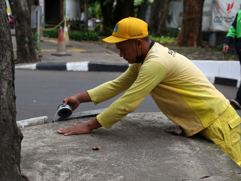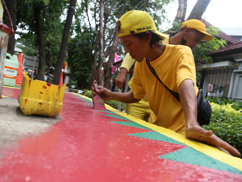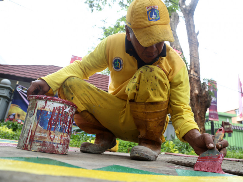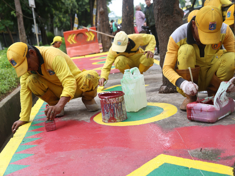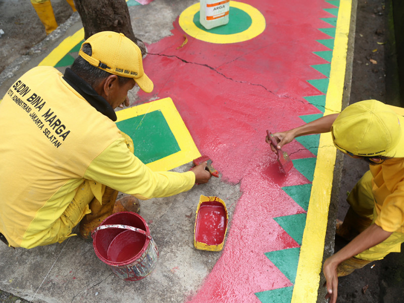 Satuan Pelaksana (Satpel) Bina Marga Kecamatan Pancoran, Jakarta Selatan mempercantik trotoar di Jalan Raya Kalibata, Kelurahan Rawajati. Kegiatan berupa pengecatan trotoar bertema ornamen Betawi tersebut saat ini pengerjaannya sudah mencapai 75 persen. (Foto: Reza Hapiz/beritajakarta.id)