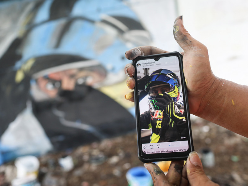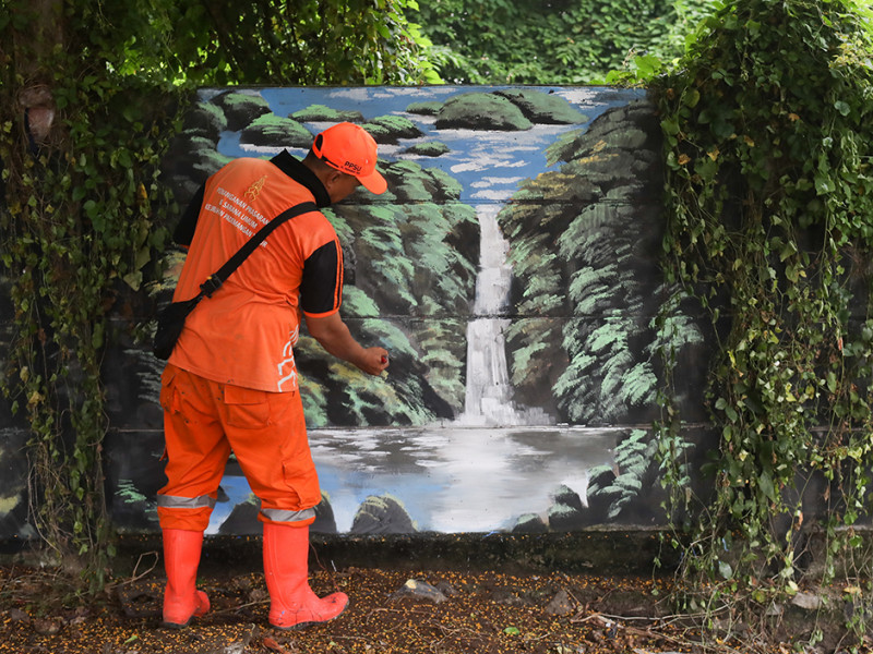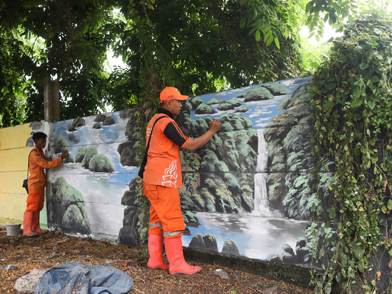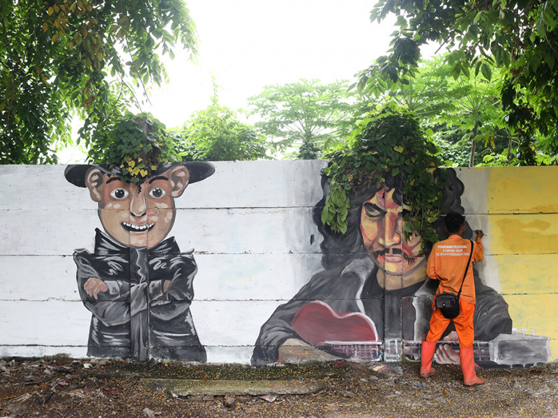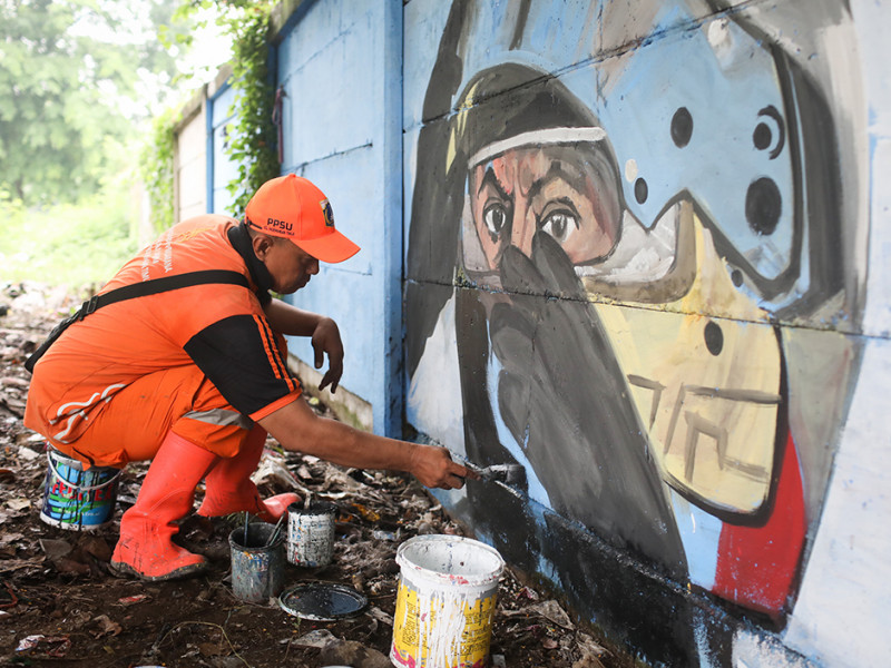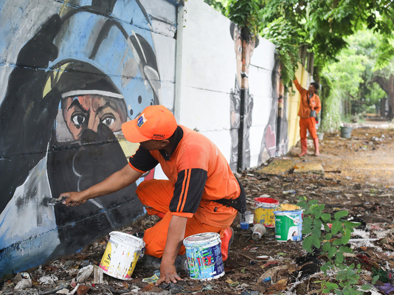 Petugas Penanganan Prasarana dan Sarana Umum (PPSU) Kelurahan Pademangan Timur memanfaatkan tanaman liar sebagai ornamen mural. Pelukisan mural pada tembok di Jalan Rajawali Utara, Pademangan, Jakarta Utara tersebut tak lain untuk meningkatkan estetika lingkungan. (Foto: Nugroho Sejati/beritajakarta.id)