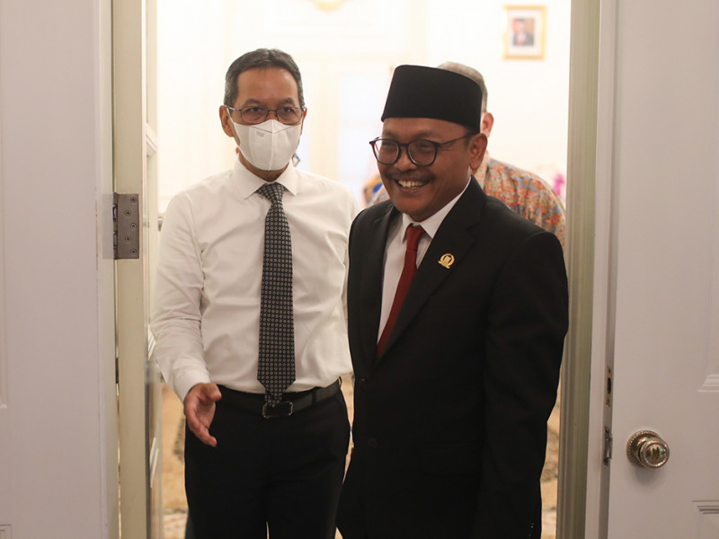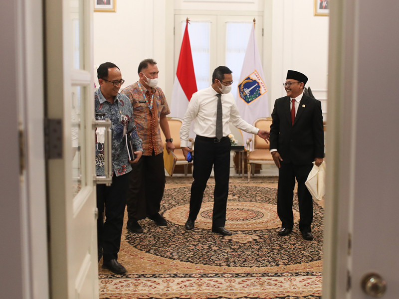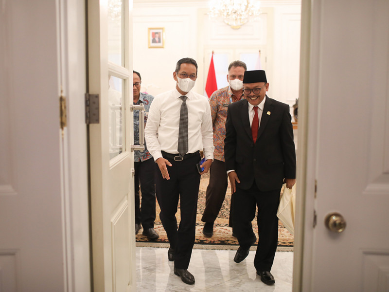 Sekretaris Komisi D DPRD DKI Jakarta, Syarif, mengunjungi Penjabat (Pj) Gubernur, Heru Budi Hartono di Ruang Rapat TPUT Balai Kota, Gambir, Jakarta Pusat, Kamis (27/10). Kunjungan Syarif tersebut dalam rangka silaturahmi sekaligus meningkatkan sinergisitas antara eksekutif dengan legislatif, guna membenahi Jakarta yang lebih baik dan maju. (Foto: Nugroho Sejati/beritajakarta.id)