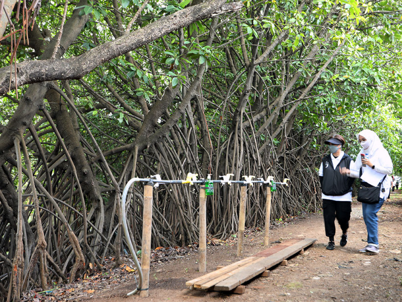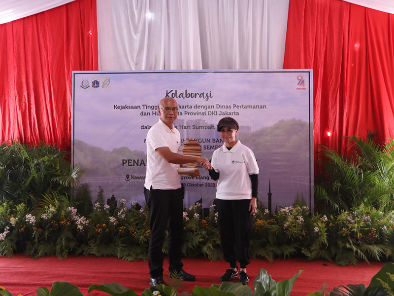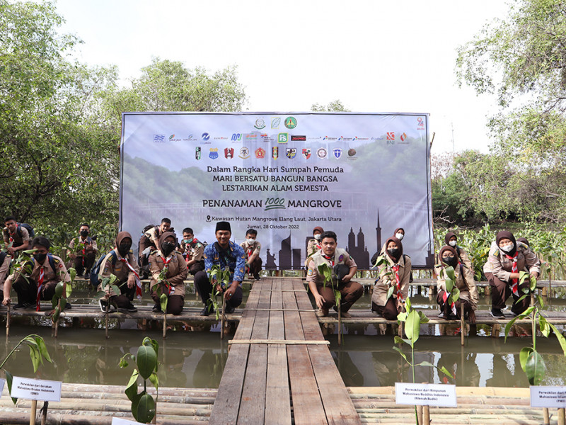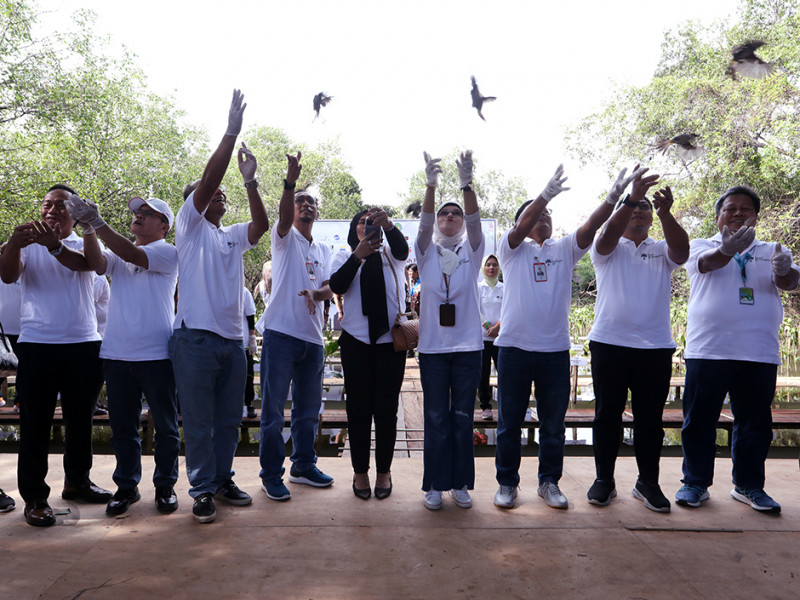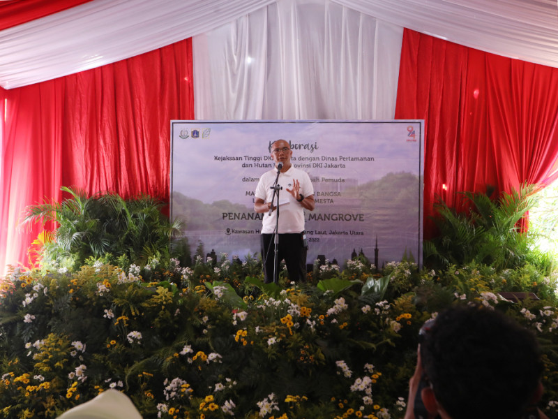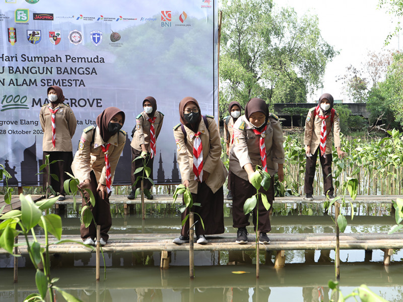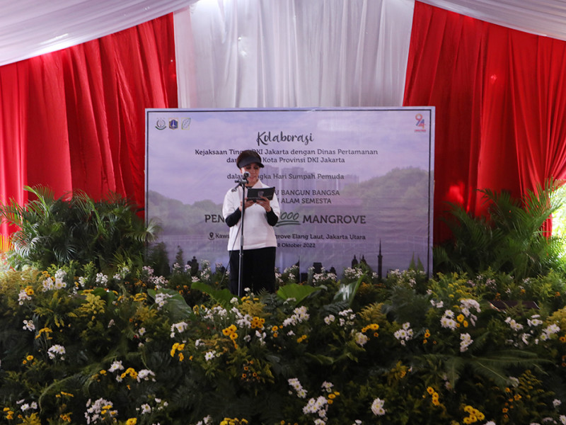 Kejaksaan Tinggi (Kejati) DKI Jakarta bersama Pemerintah Provinsi (Pemprov) DKI Jakarta melalui Dinas Pertamanan dan Hutan Kota melakukan aksi penanaman 1.028 bibit mangrove di Kawasan Hutan Mangrove Elang Laut, Pantai Indah Kapuk (PIK), Penjaringan, Jakarta Utara, Jumat (28/10). Tidak hanya melakukan penanaman mangrove, pihaknya juga melepas 28 burung dengan habitat hidup di mangrove. Aksi tersebut dalam rangka memperingati Hari Sumpah Pemuda. (Foto: Agustinus Yossy/beritajakarta)