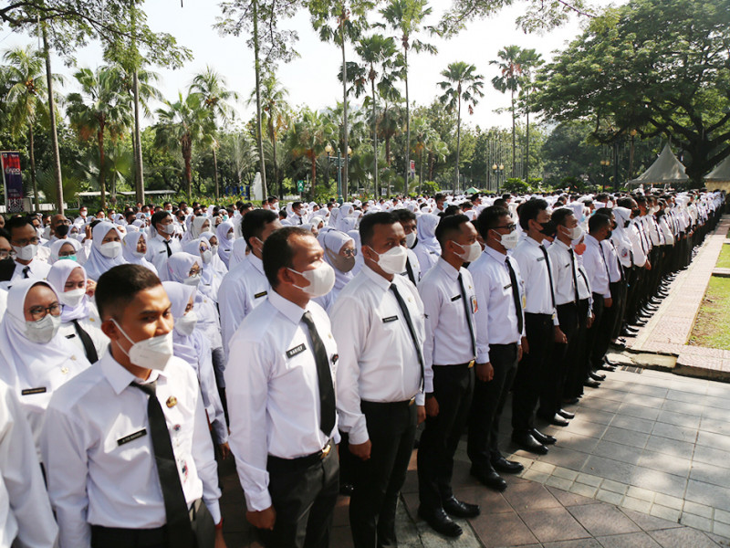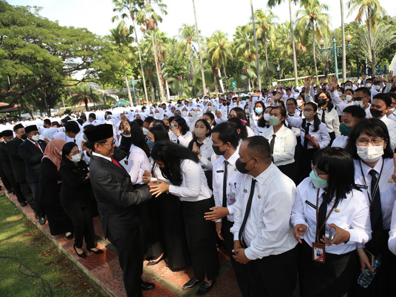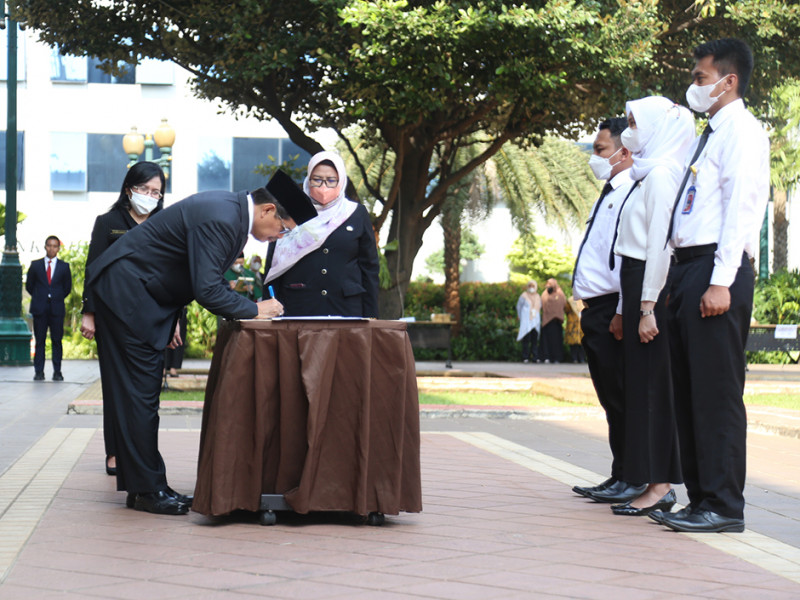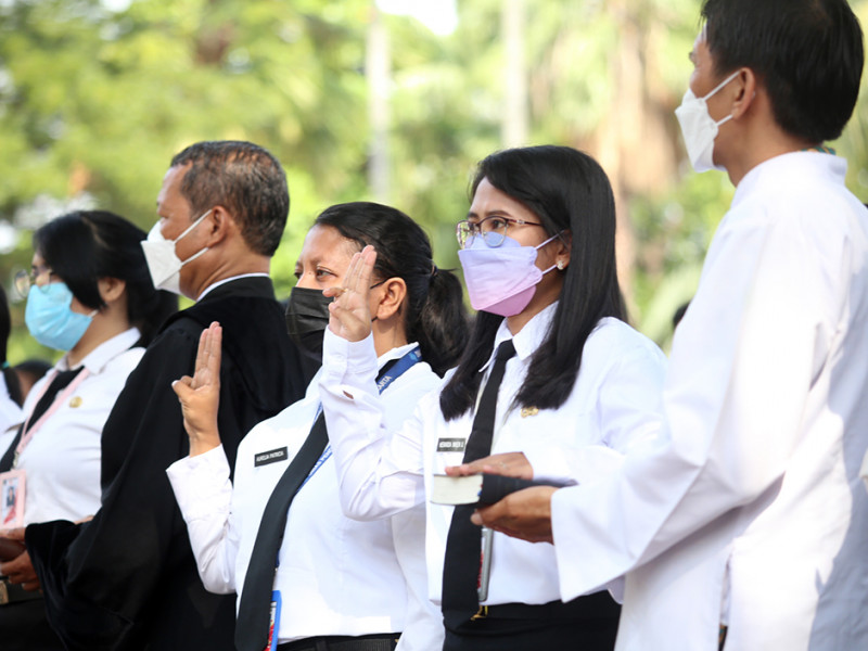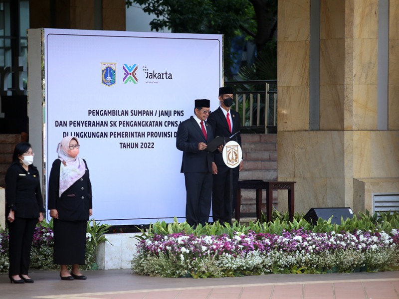 Pemerintah Provinsi (Pemprov) DKI Jakarta mengangkat 1.594 Calon Pegawai Negeri Sipil (CPNS) menjadi Pegawai Negeri Sipil (PNS). Prosesi pengambilan Sumpah/Janji PNS dan penyerahan Kepgub tentang Pengangkatan CPNS menjadi PNS dipimpin oleh Sekretaris Daerah (Sekda) Provinsi DKI Jakarta, Marullah Matali di halaman Balai Kota, Selasa (1/11). (Foto: Mochamad Tresna Suheryanto/beritajakarta.id)