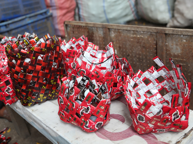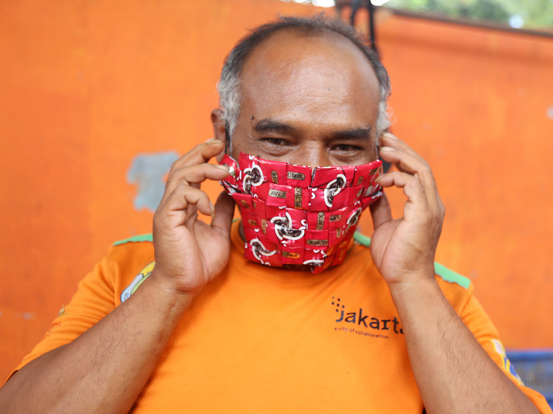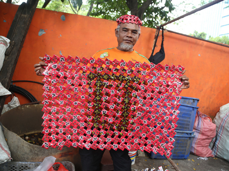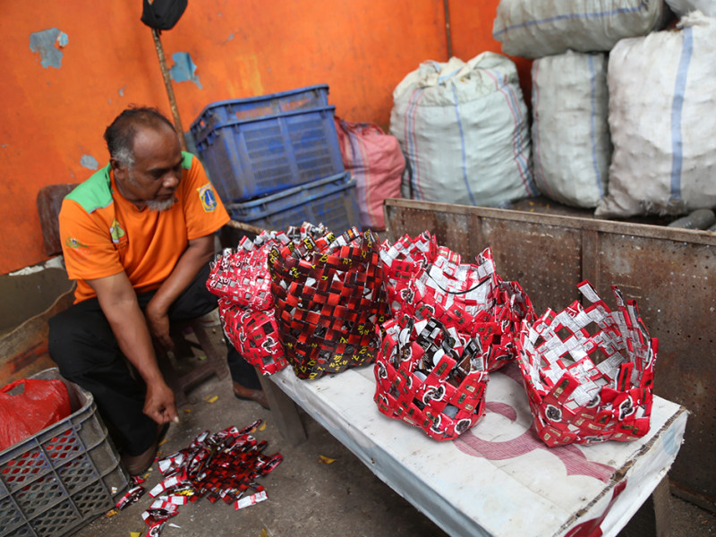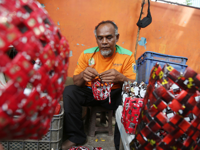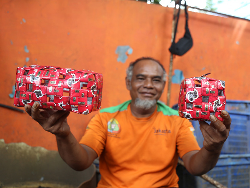 Sampah plastik merupakan sampah yang sulit terurai secara alamiah. Hal tersebut menggerakkan hati Nurawi untuk mengolahnya menjadi barang yang bermanfaat. Di sela pekerjaannya sebagai petugas UPK Badan Air Dinas Lingkungan Hidup, Kecamatan Menteng, Jakarta Pusat, Nurawi mengumpulkan sampah plastik berupa bungkus kopi untuk dikreasikan menjadi beragam jenis kerajinan tangan unik. (Foto: Reza Hapiz/beritajakarta.id)