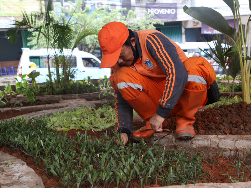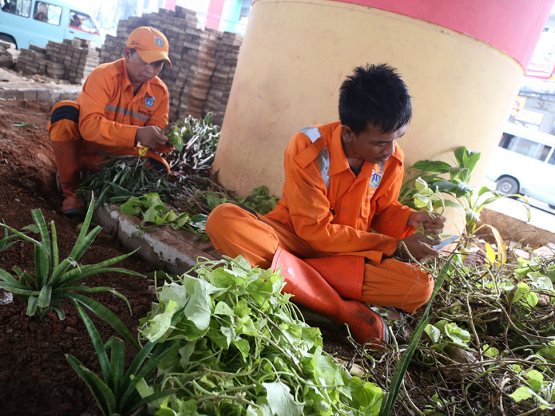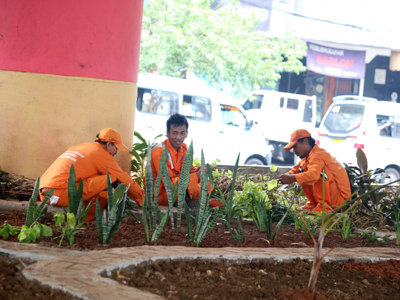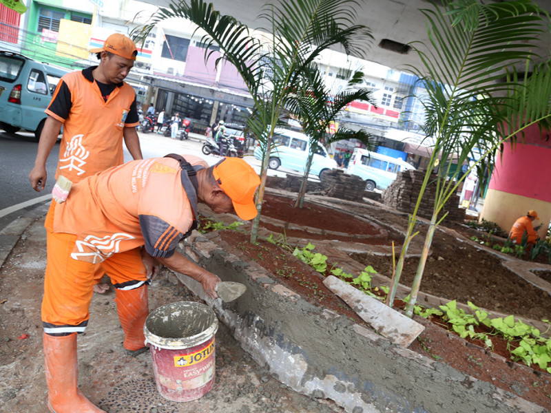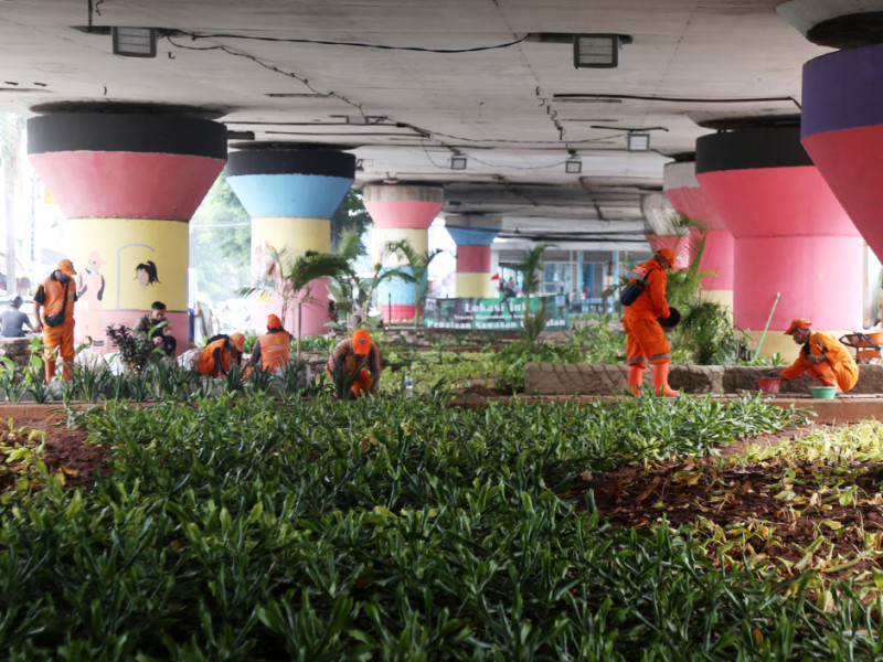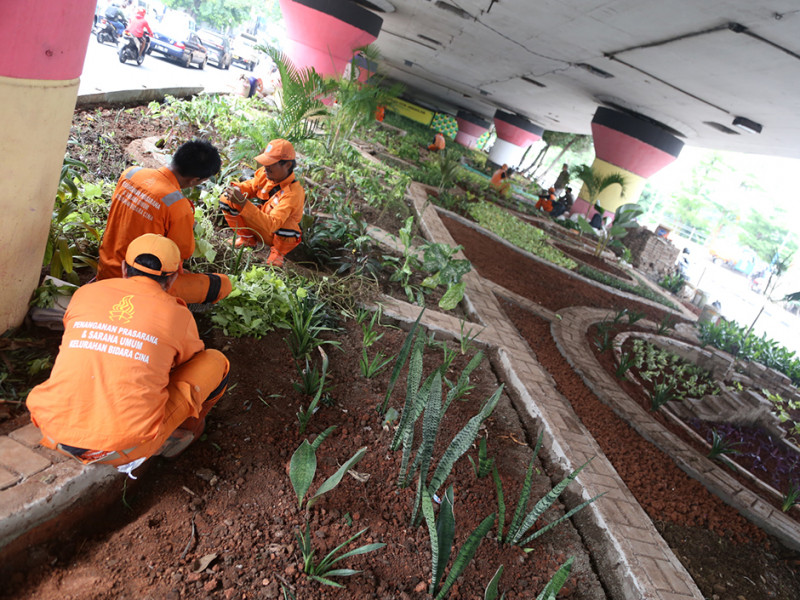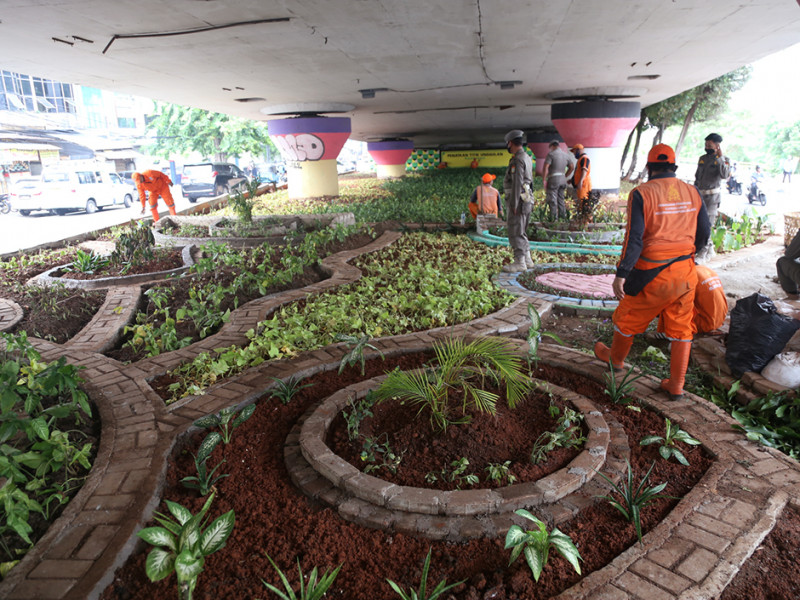 Kolong Flyover Kampung Melayu, Jatinegara, Jakarta Timur saat ini tengah dilakukan penataan. Area selebar 12 meter tersebut kini makin cantik dengan hadirnya taman berisikan berbagai jenis tanaman hias. (Foto: Reza Hapiz/beritajakarta.id)