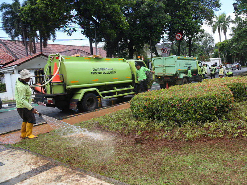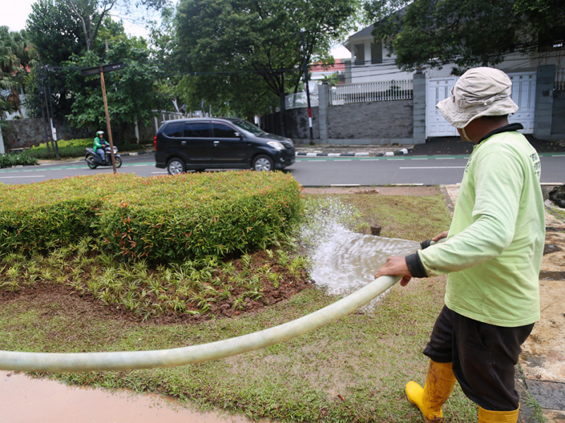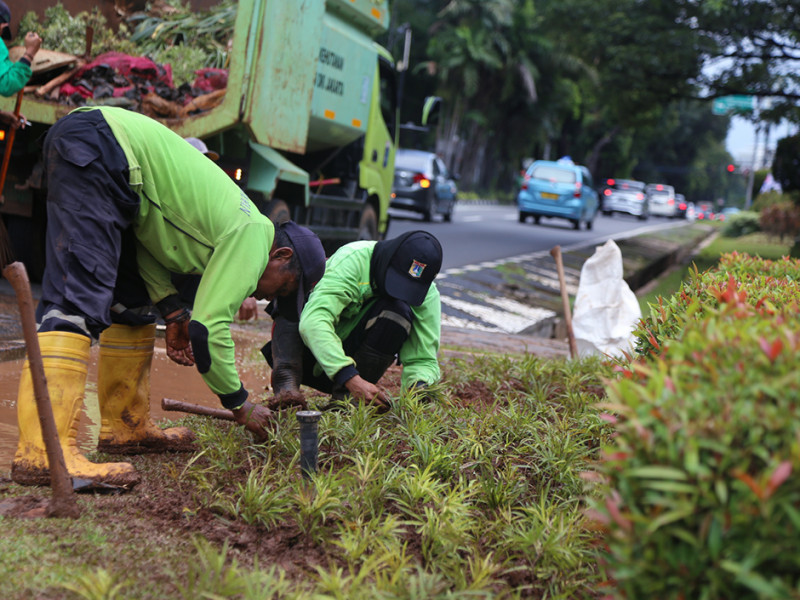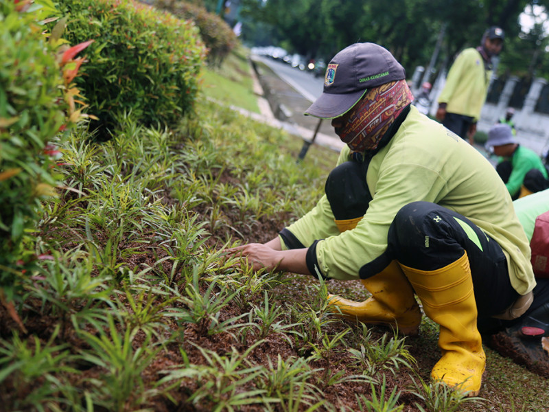 Suku Dinas (Sudin) Pertamanan dan Hutan Kota Jakarta Pusat melakukan penataan jalur hijau di Jalan Imam Bonjol, Menteng. Penataan dilakukan dengan meremajakan sejumlah tanaman agar jalur hijau tetap indah dan asri. (Foto: Reza Hapiz/beritajakarta.id)