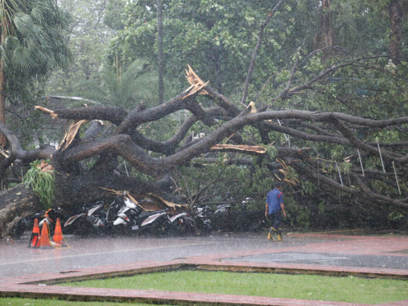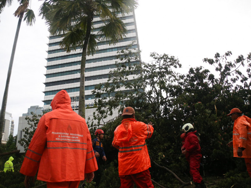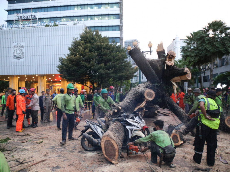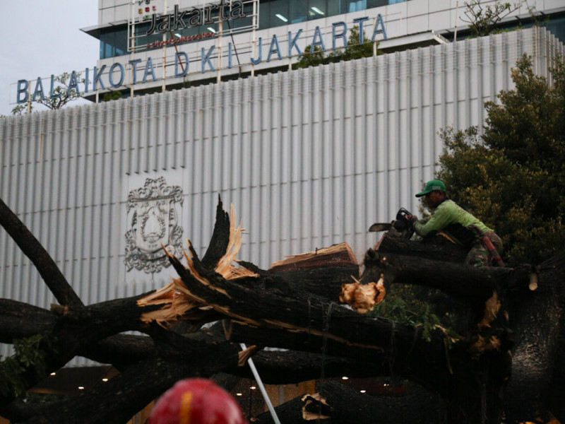 Puluhan Personel Gabungan Tangani Pohon Tumbang di Halaman Balai KotanPuluhan personel gabungan dari unsur Suku Dinas Pertamanan dan Hutan Kota Jakarta Pusat, Satpol PP, petugas Penanganan Prasarana dan Sarana Umum (PPSU), Suku Dinas Penanggulangan Kebakaran dan Penyelamatan (Gulkarmat) serta Badan Penanggulangan Bencana Daerah (BPBD) dikerahkan mengevakuasi pohon tumbang di halaman Balai Kota DKI Jakarta, Kamis (10/11) sore. (Foto: Mochamad Tresna Suheryanto/beritajakarta.id)