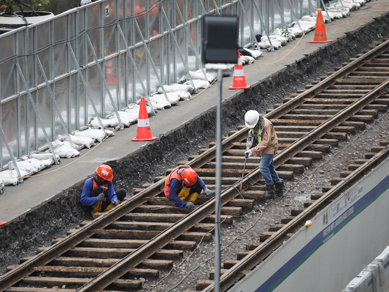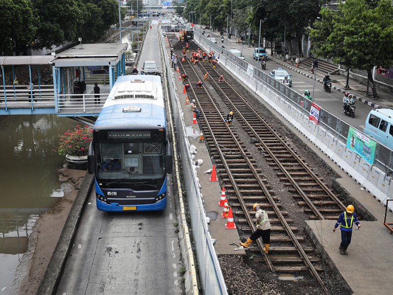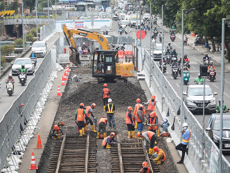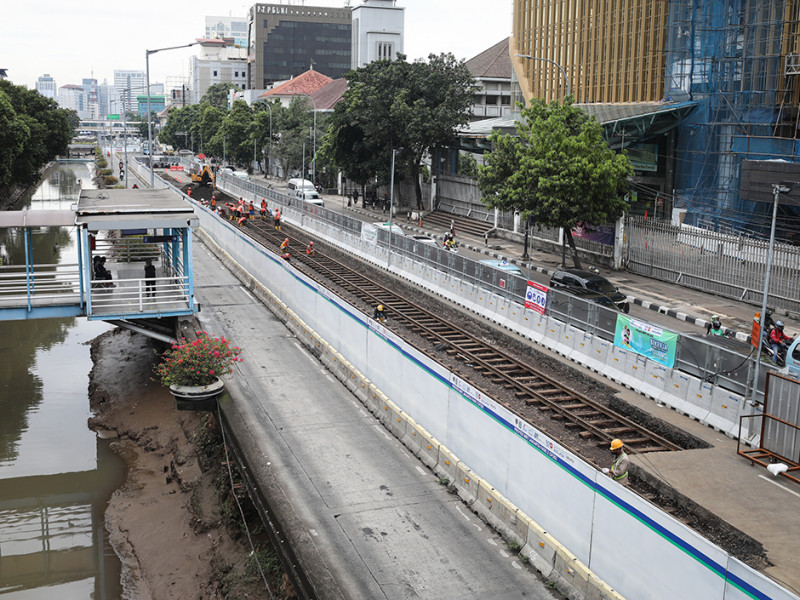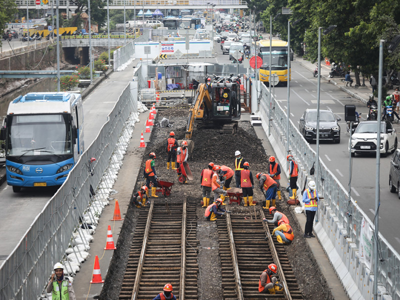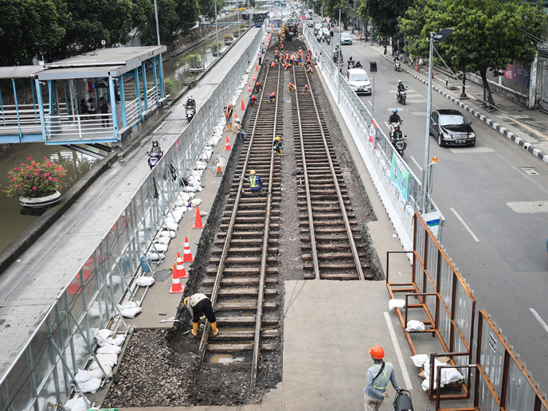 Pekerja melakukan proses relokasi temuan rel trem di proyek MRT Jakarta fase 2A CP 202 di Jalan Gajah Mada, Gambir, Jakarta Pusat, Jumat (11/11). Rel trem berusia lebih dari 100 tahun tersebut akan direlokasi sementara ke storage pool PPD Jelambar. (Foto: Nugroho Sejati/beritajakarta.id)