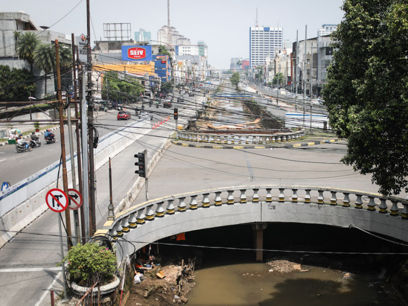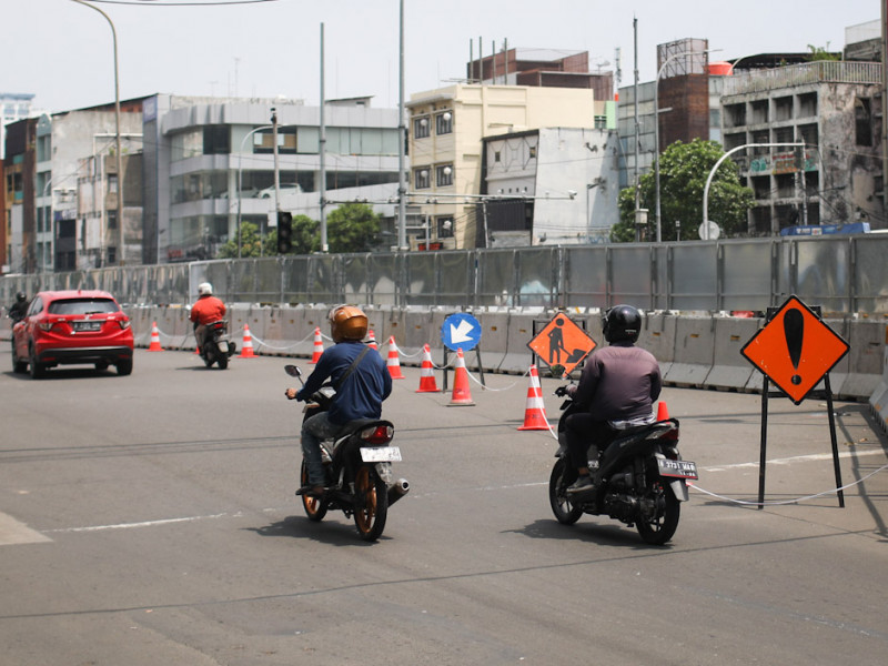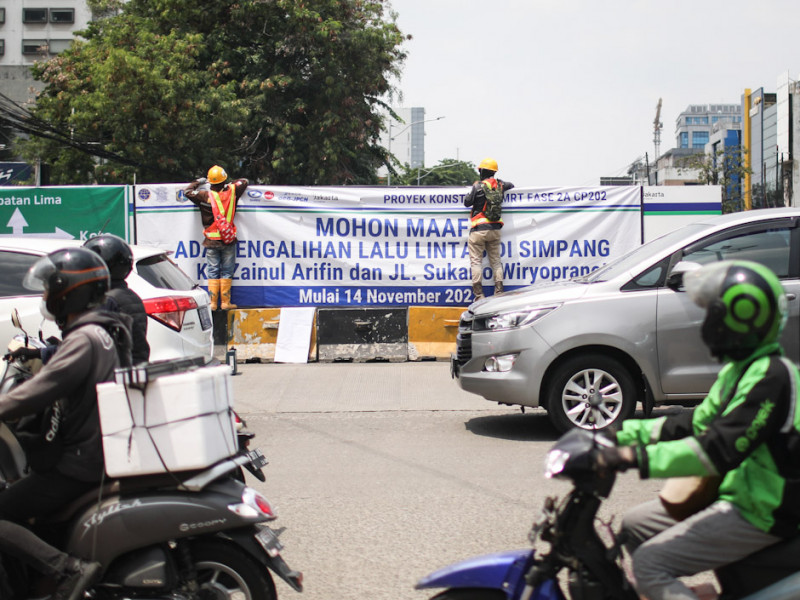 Rekayasa lalu lintas (lalin) diberlakukan di simpang Jalan KH Zainul Arifin dan Jalan Sukarjo Wiryopranoto, Gambir, Jakarta Pusat, Senin (14/11). Kebijakan ini terkait proyek konstruksi MRT Fase 2A CP 202. (Foto: Nugroho Sejati/beritajakarta.id)