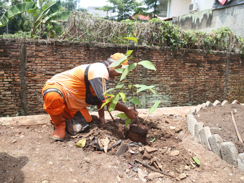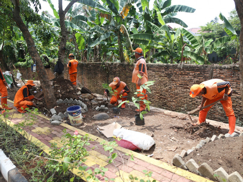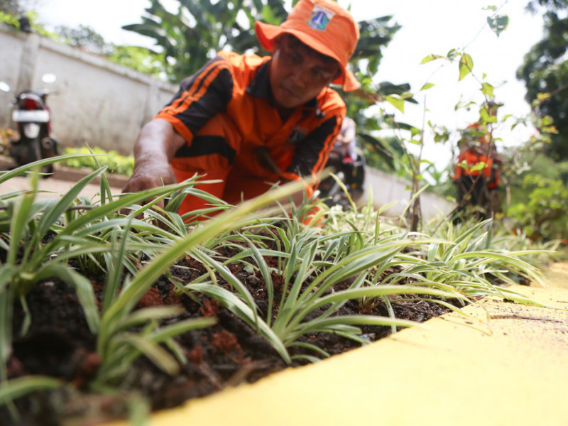 Petugas Penanganan Prasarana dan Sarana Umum (PPSU) Kelurahan Ragunan, Pasar Minggu, Jakarta Selatan melakukan penataan kawasan Jalan Poncol, Senin (14/11). Penataan ini dilakukan untuk semakin memberikan kenyamanan dan meningkatkan estetika. Penataan sepanjang 200 meter ini dipercantik dengan paving block untuk troto ar dan ditanami aneka tanaman hias ataupun produktif, pengerjaan ini ditargetkan rampung pertengahan Desember mendatang (Foto: Reza Hapiz/beritajakarta.id)