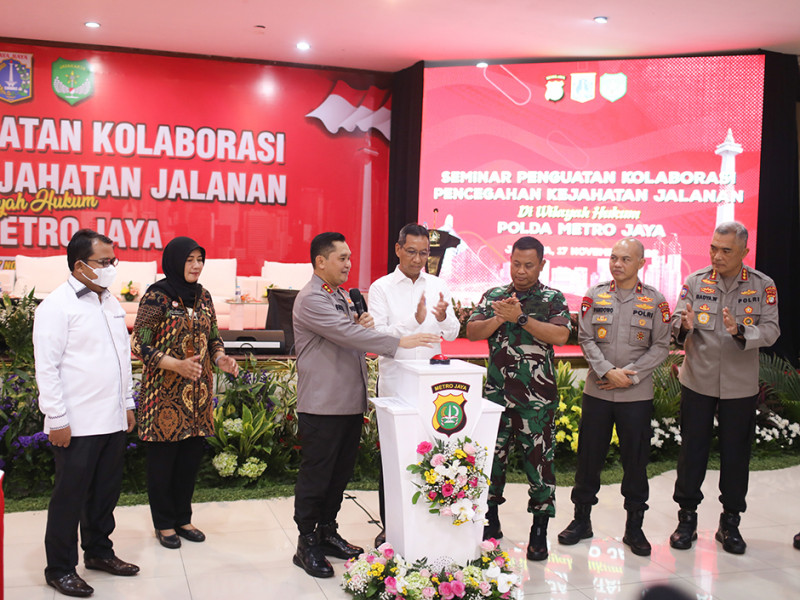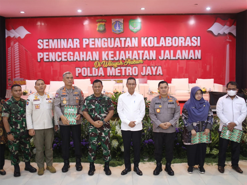 Penjabat (Pj) Gubernur DKI Jakarta, Heru Budi Hartono bersama Kapolda Metro Jaya, Irjen Pol Mohammad Fadil Imran dan Panglima Kodam Jaya, Mayjen Untung Budiharto menandatangani kesepakatan Pencegahan Bersama Masalah Kejahatan Jalanan di Gedung Balai Pertemuan Polda Metro Jaya, Jakarta Selatan, Kamis (17/11). Kesepakatan tersebut juga ditandatangani oleh Kepala Satpol PP Provinsi DKI Jakarta, Arifin; Kepala Dinas Pendidikan DKI Jakarta, Nahdiana; Kepala Dinas Sosial DKI Jakarta, Premi Lasari; Aster Kasdam Jaya, Stefie Jantje Nuhujanan; Dirbinmas Polda Metro Jaya, Badya Wijaya; Kepala Bapas Kelas I Wilayah Jakarta Barat, Sri Susilarti; Ketua KPAI, Susanto; dan Kepala Kanwil Kemenag Provinsi DKI Jakarta, Cecep Khairul Anwar. (Foto: Nugroho Sejati/beritajakarta.id)